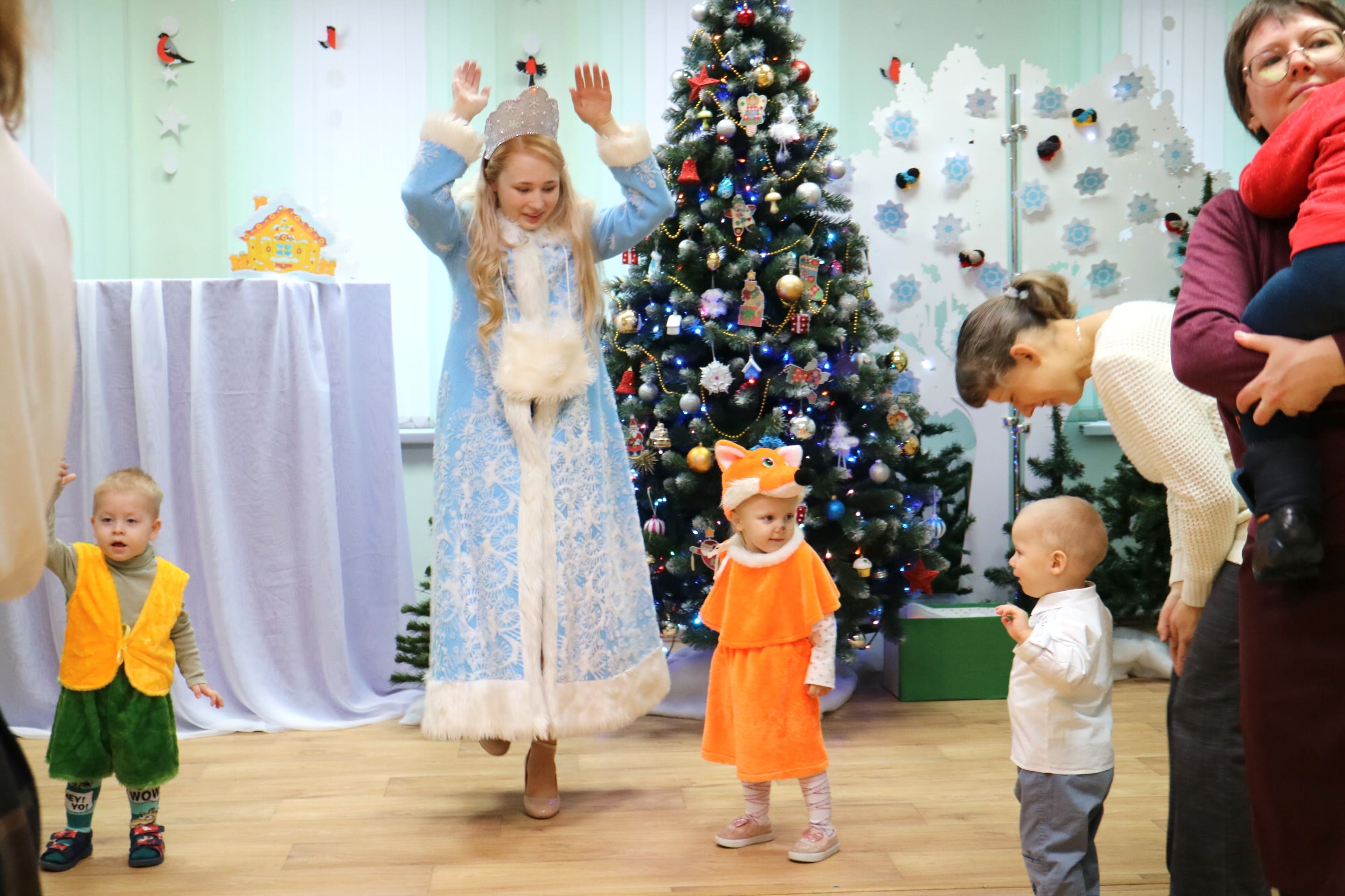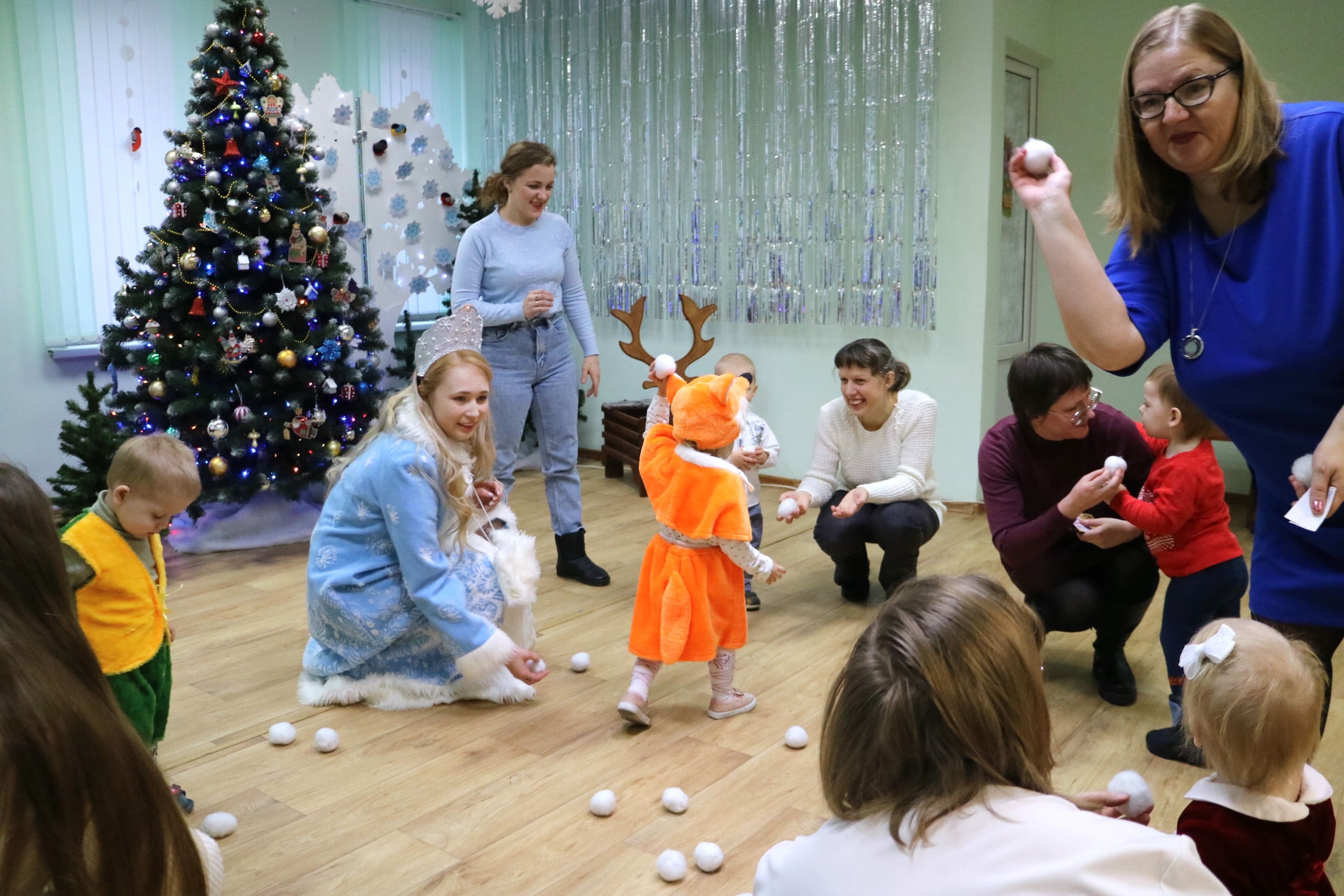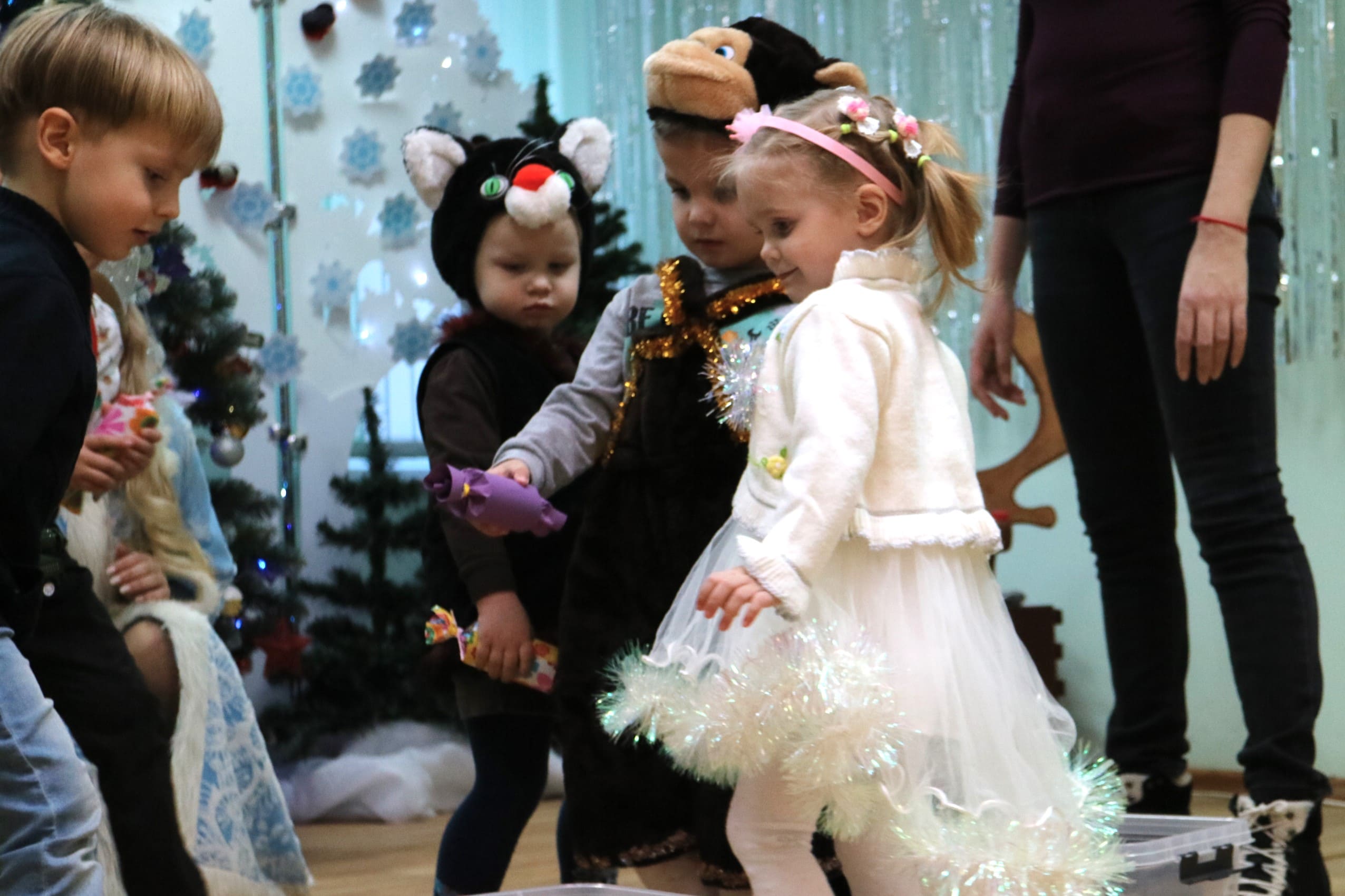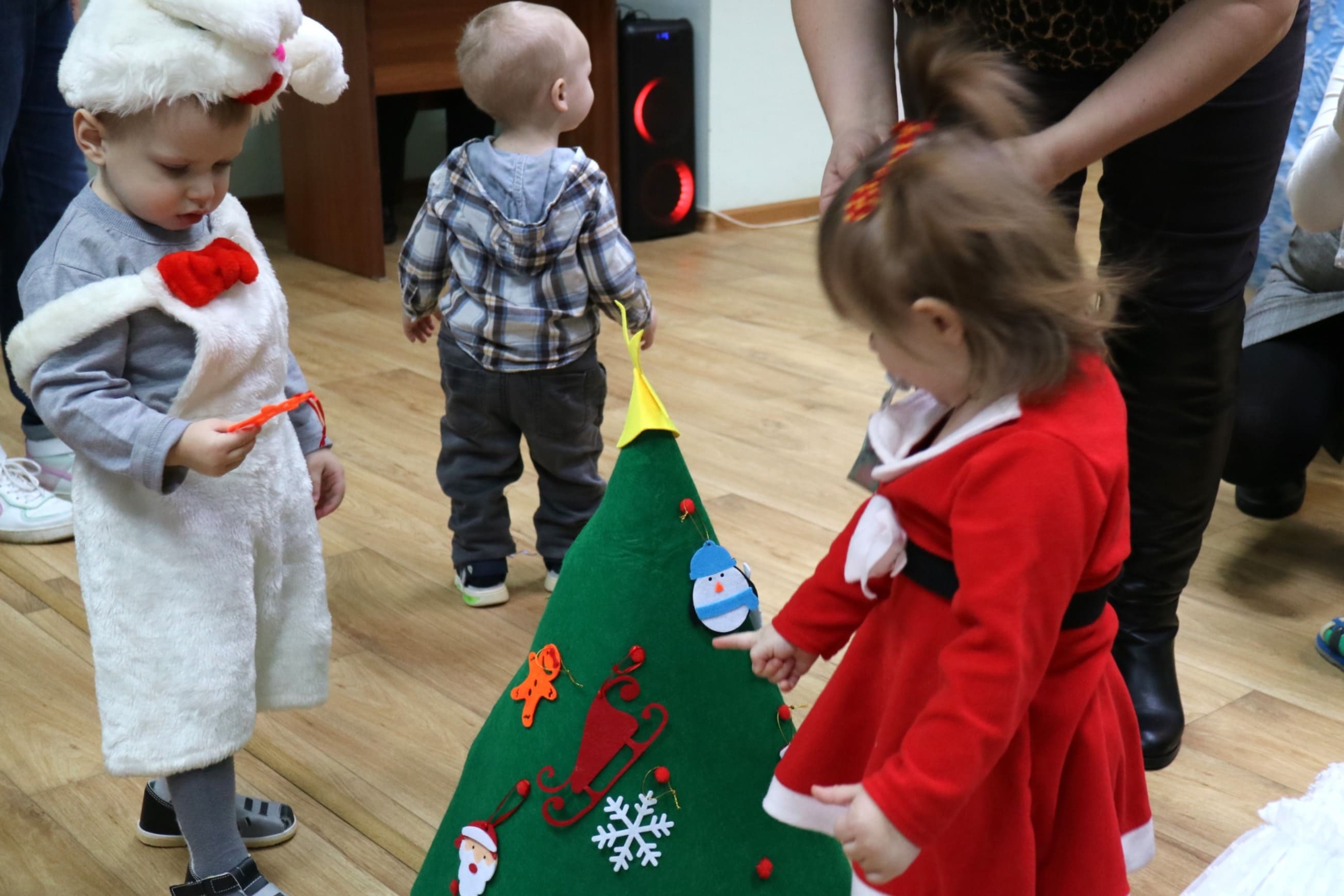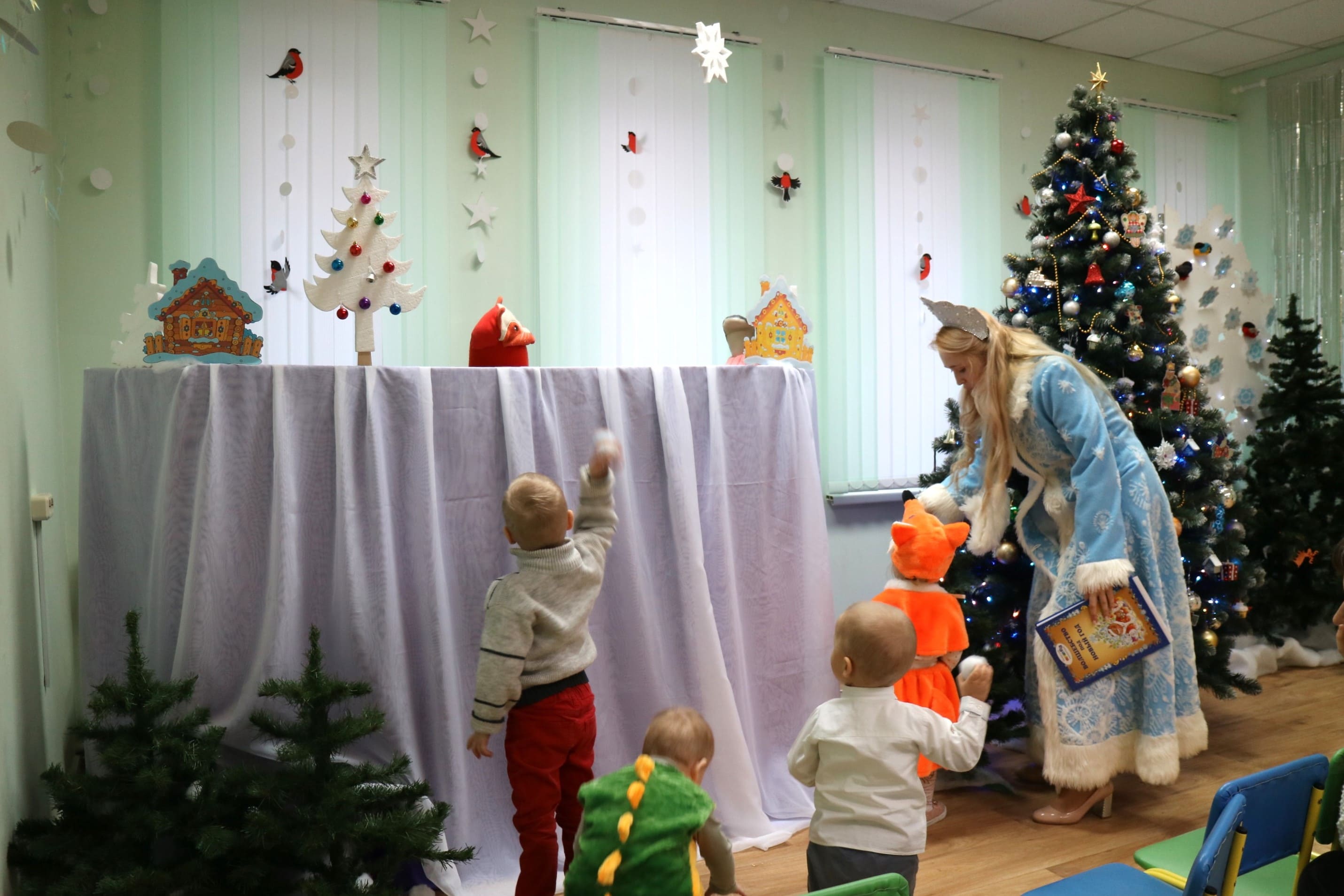 Вместе со Снегурочкой малыши водили хороводы, зажигали огоньки на елочке, играли в снежки, прятались от зимней метели, помогали Дедушке Морозу разложить конфеты. А также ребята поучаствовали в интерактивном кукольном спектакле: помогли Зайчику вернуть новогоднюю елочку и встретить Новый год весело.