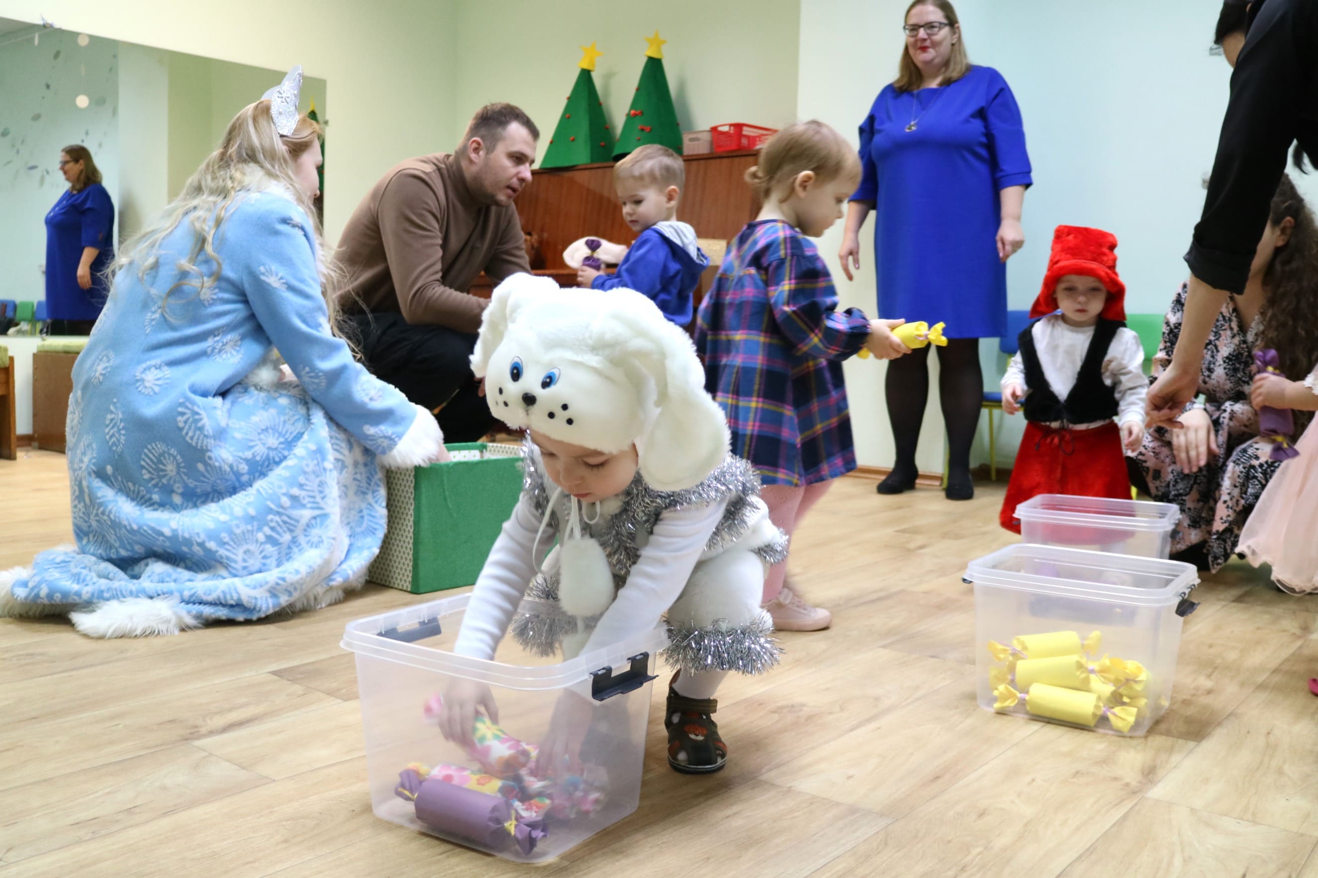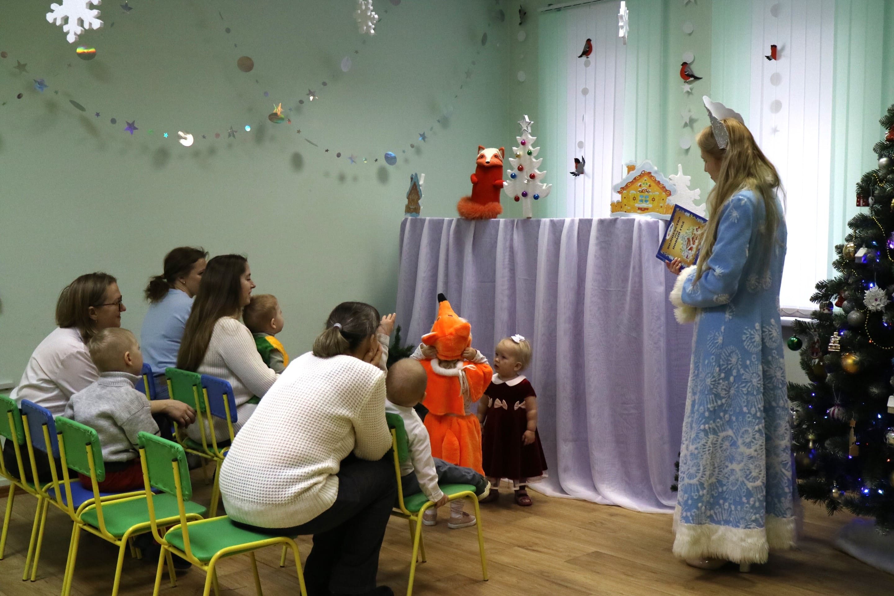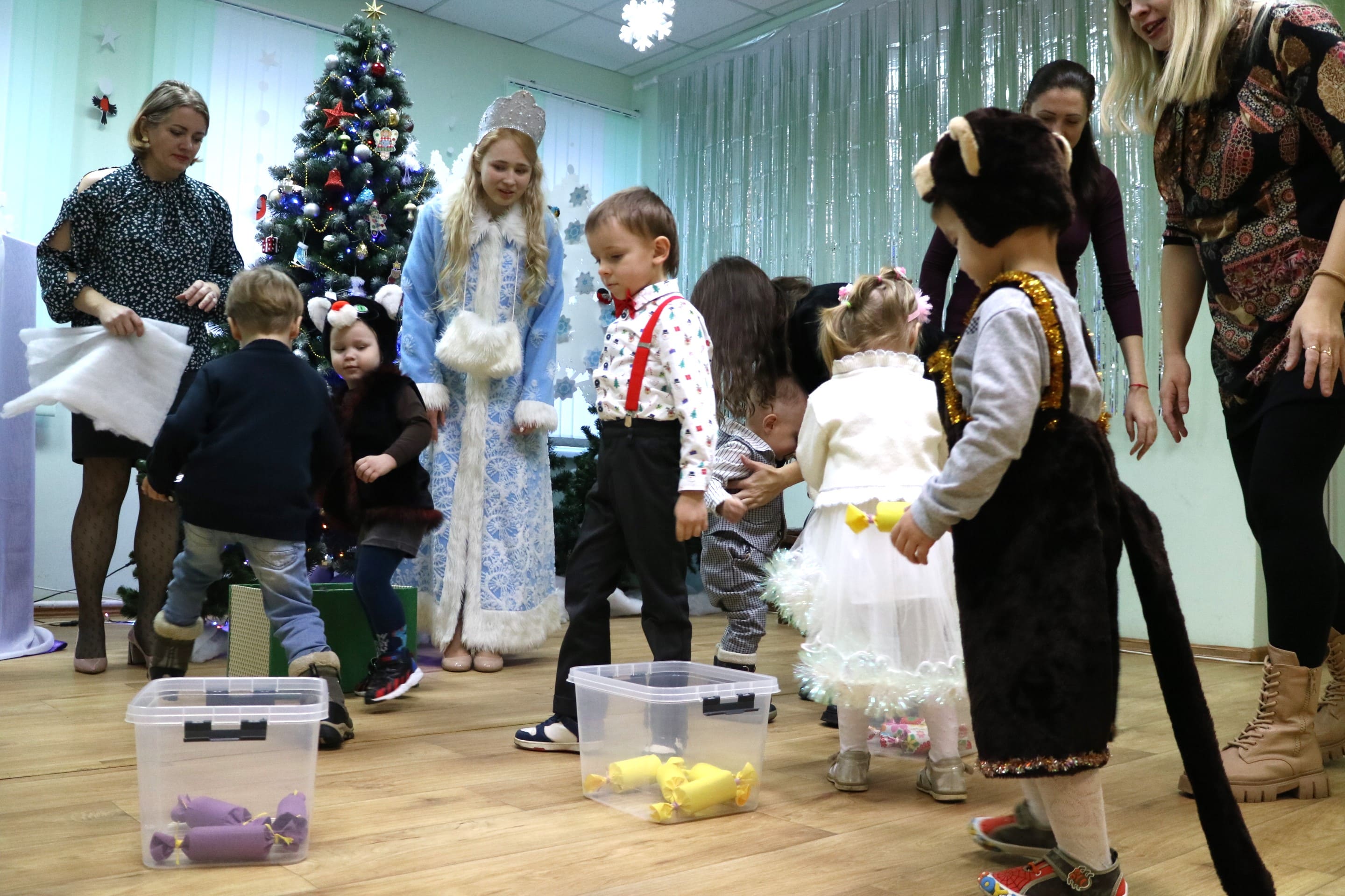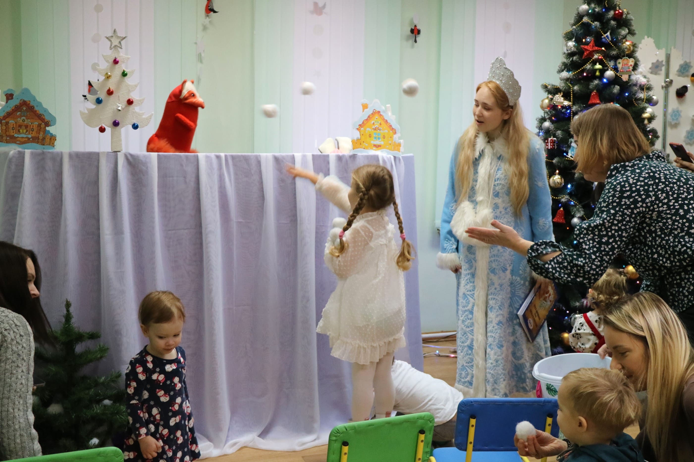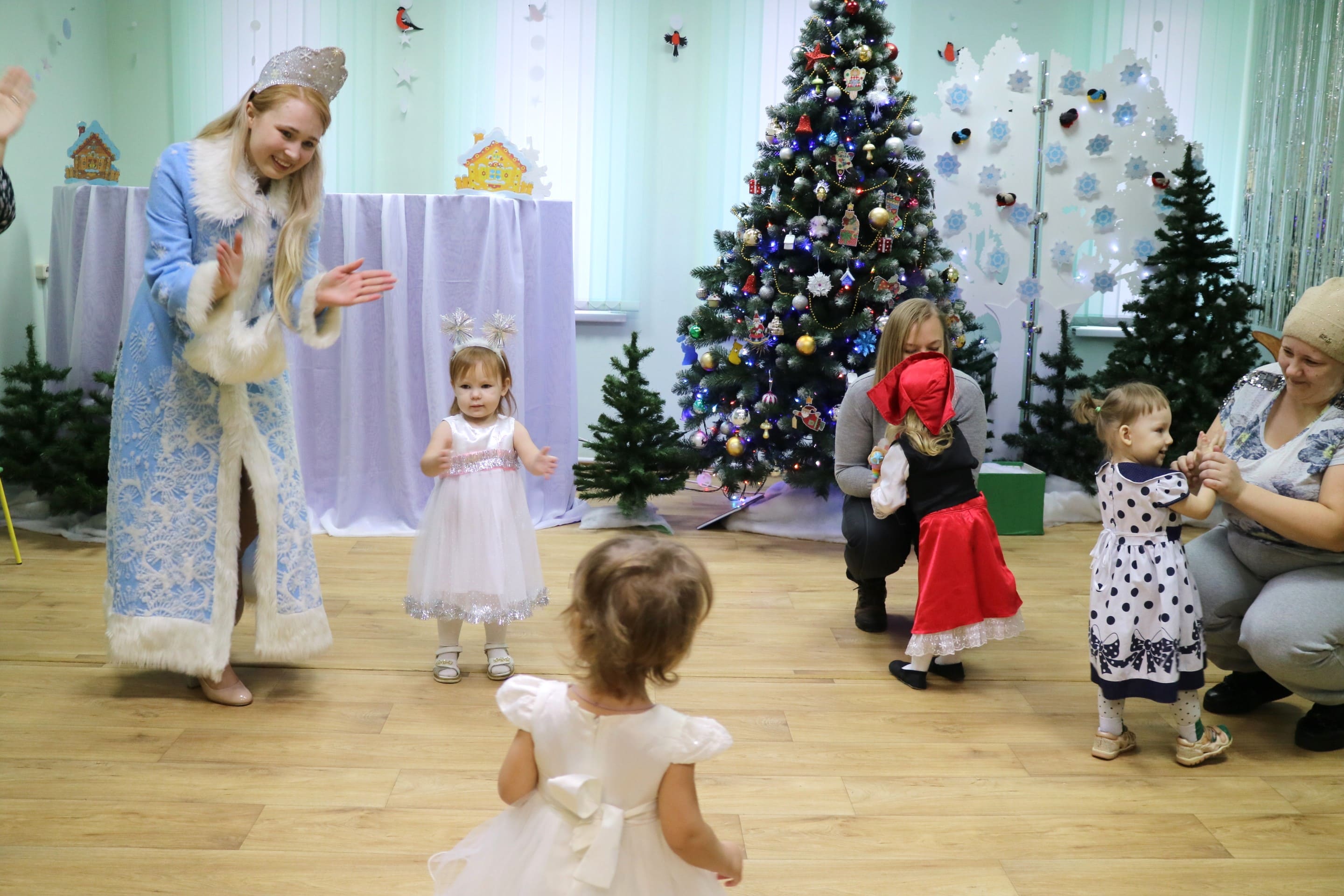Вместе со Снегурочкой малыши водили хороводы, зажигали огоньки на елочке, играли в снежки, прятались от зимней метели, помогали Дедушке Морозу разложить конфеты. А также ребята поучаствовали в интерактивном кукольном спектакле: помогли Зайчику вернуть новогоднюю елочку и встретить Новый год весело.