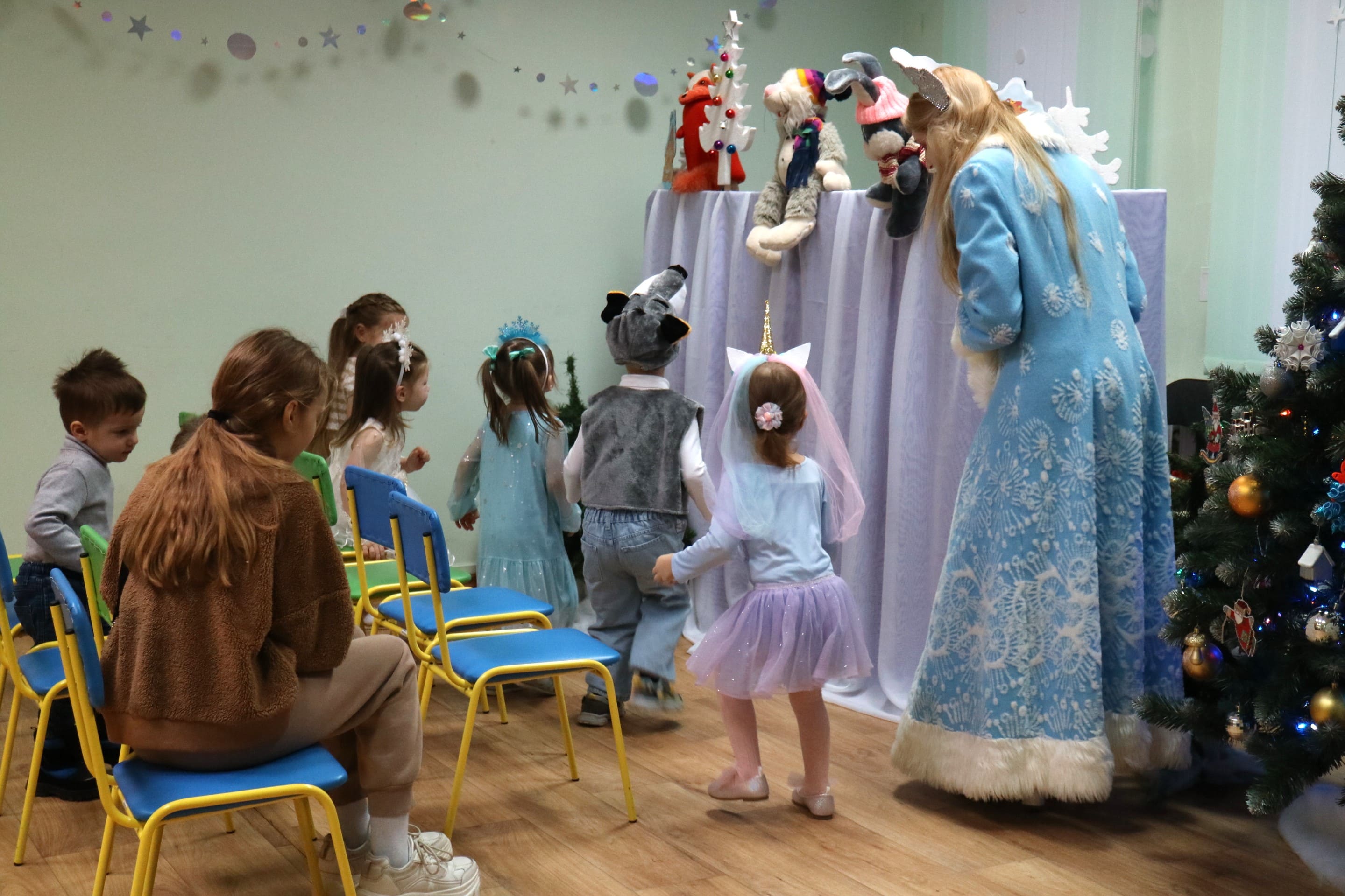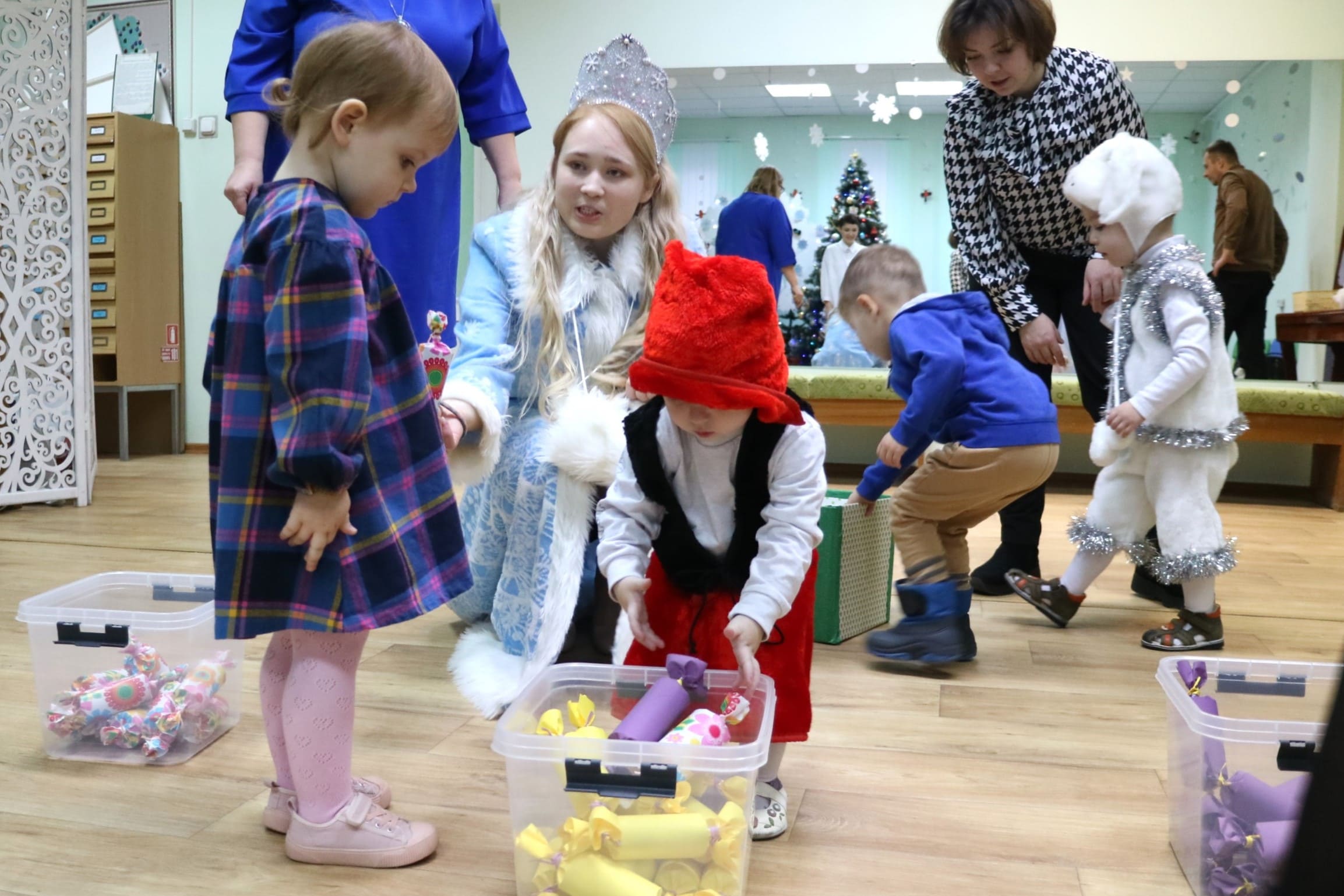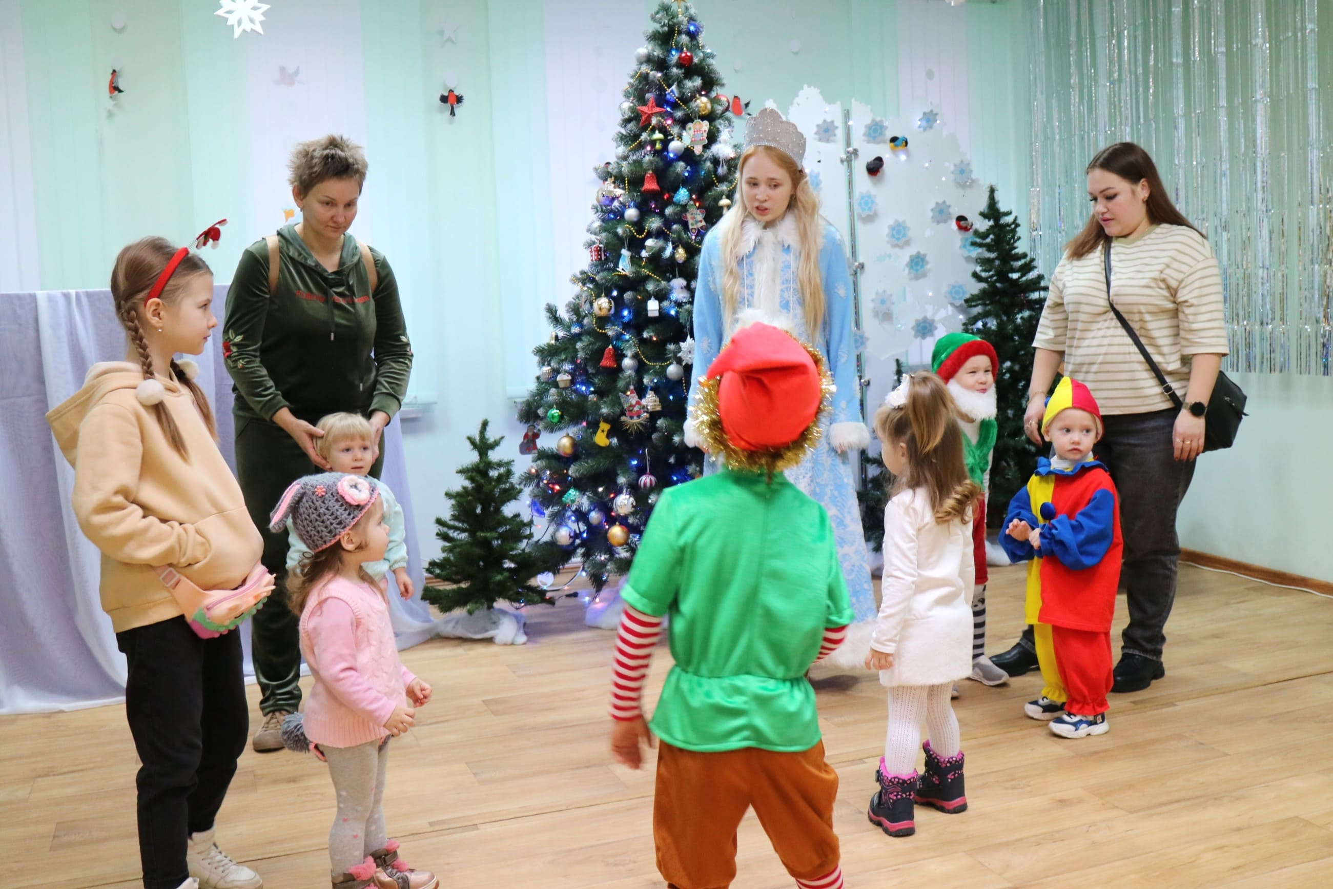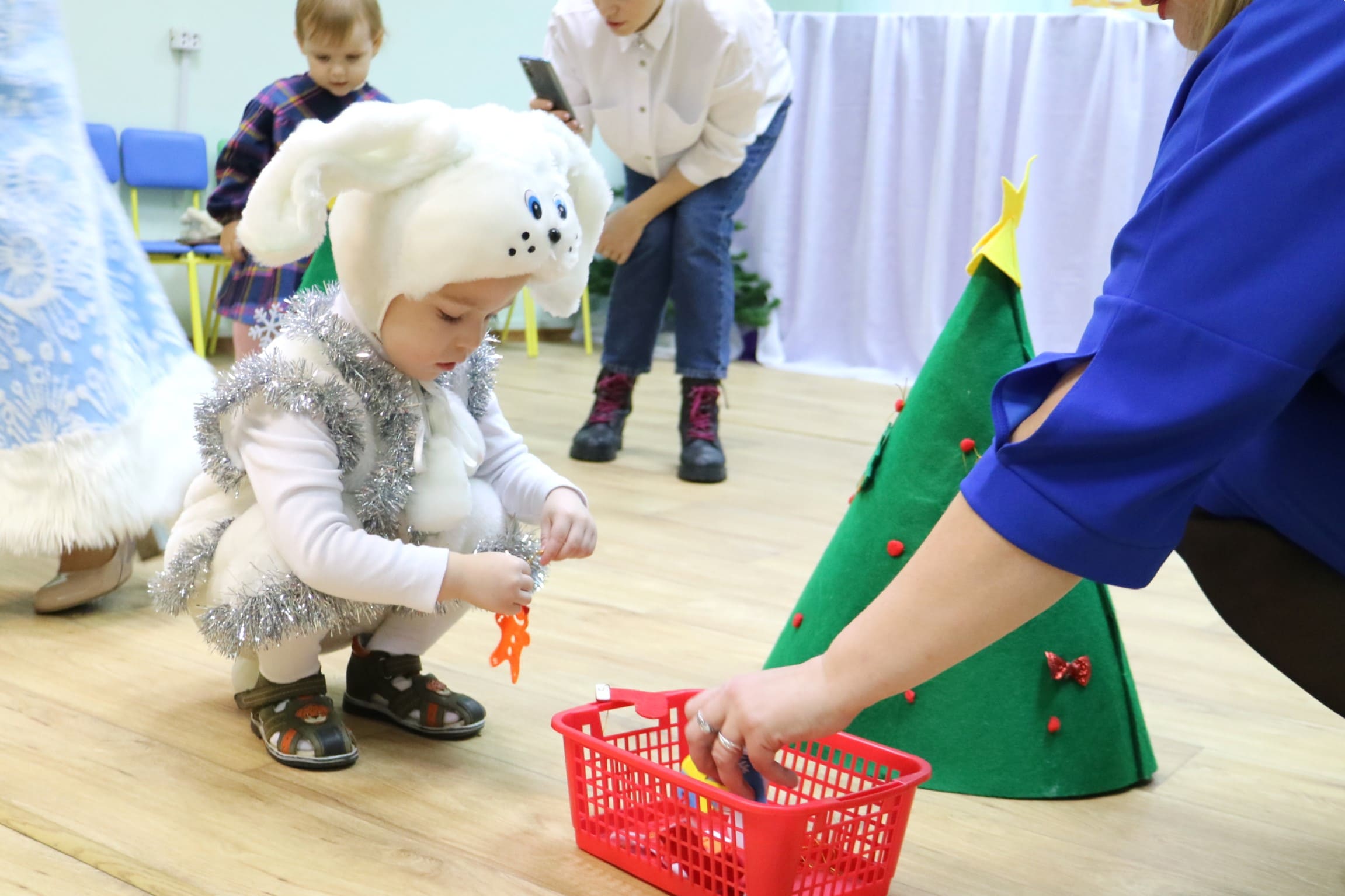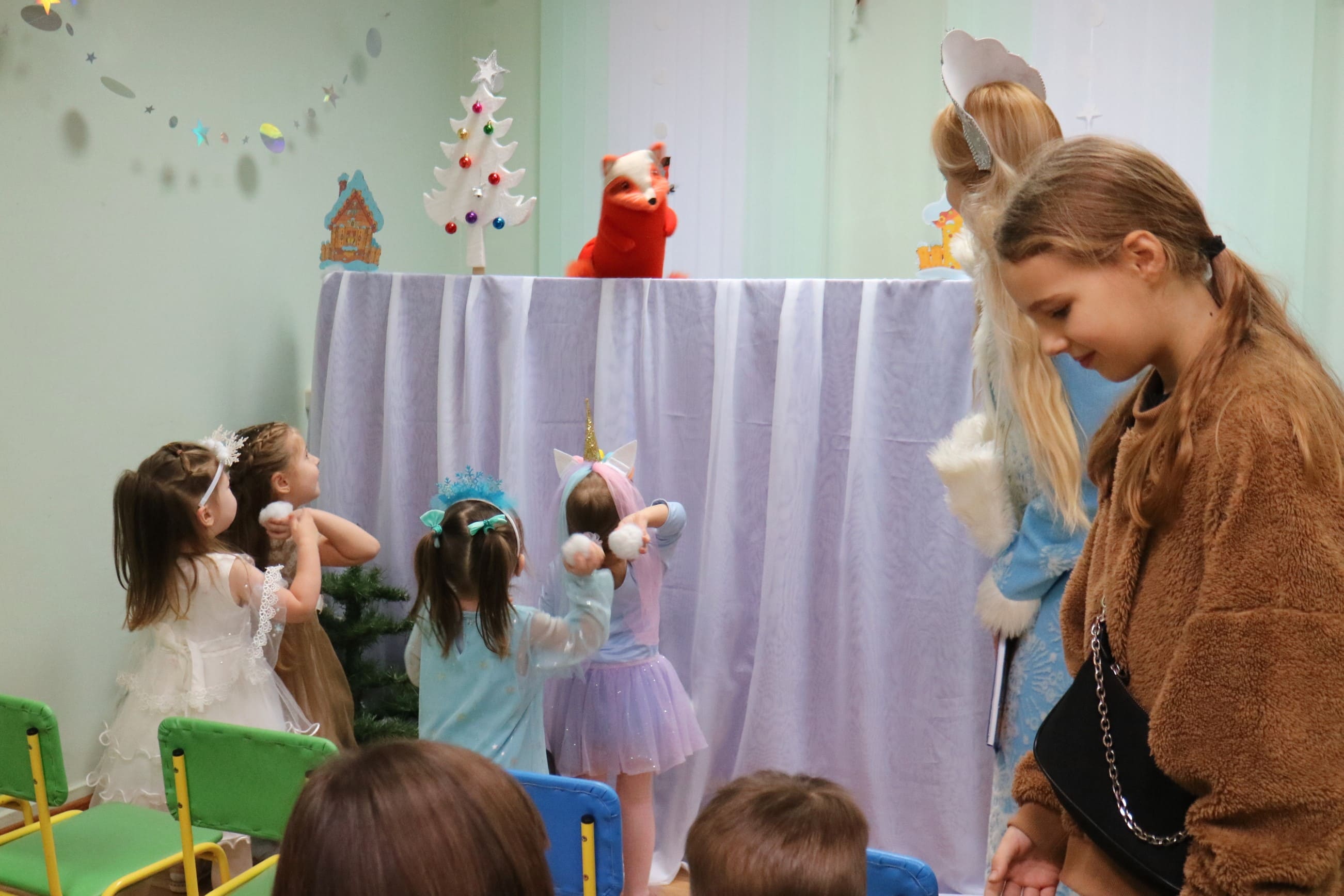 Вместе со Снегурочкой малыши водили хороводы, зажигали огоньки на елочке, играли в снежки, прятались от зимней метели, помогали Дедушке Морозу разложить конфеты. А также ребята поучаствовали в интерактивном кукольном спектакле: помогли Зайчику вернуть новогоднюю елочку и встретить Новый год весело.