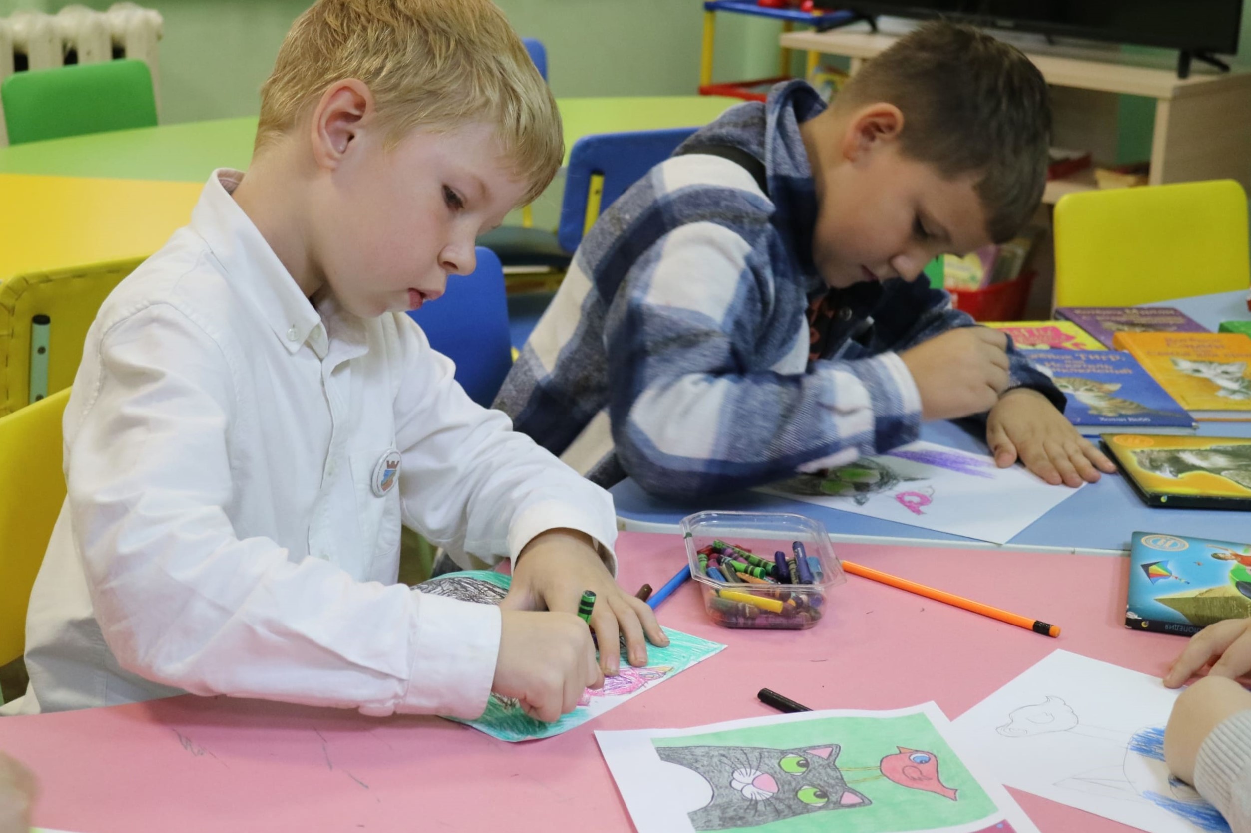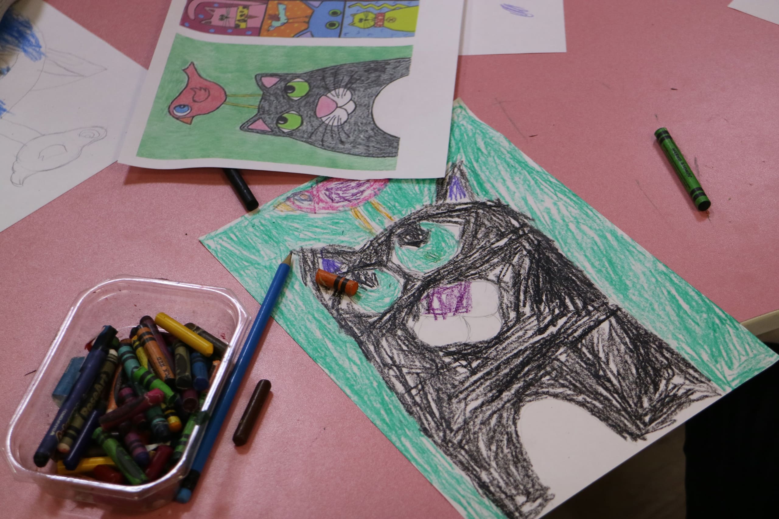Занятие началось с небольшой лекции о том, как кошки завоевали сердца людей. Мы узнали, что эти милые создания были священными животными в Древнем Египте, в их честь создавались скульптуры и даже храмы. После этого мы приступили к творческому процессу. Каждый участник получил карандаши и мелки и, конечно же, вдохновение от своих домашних любимцев.