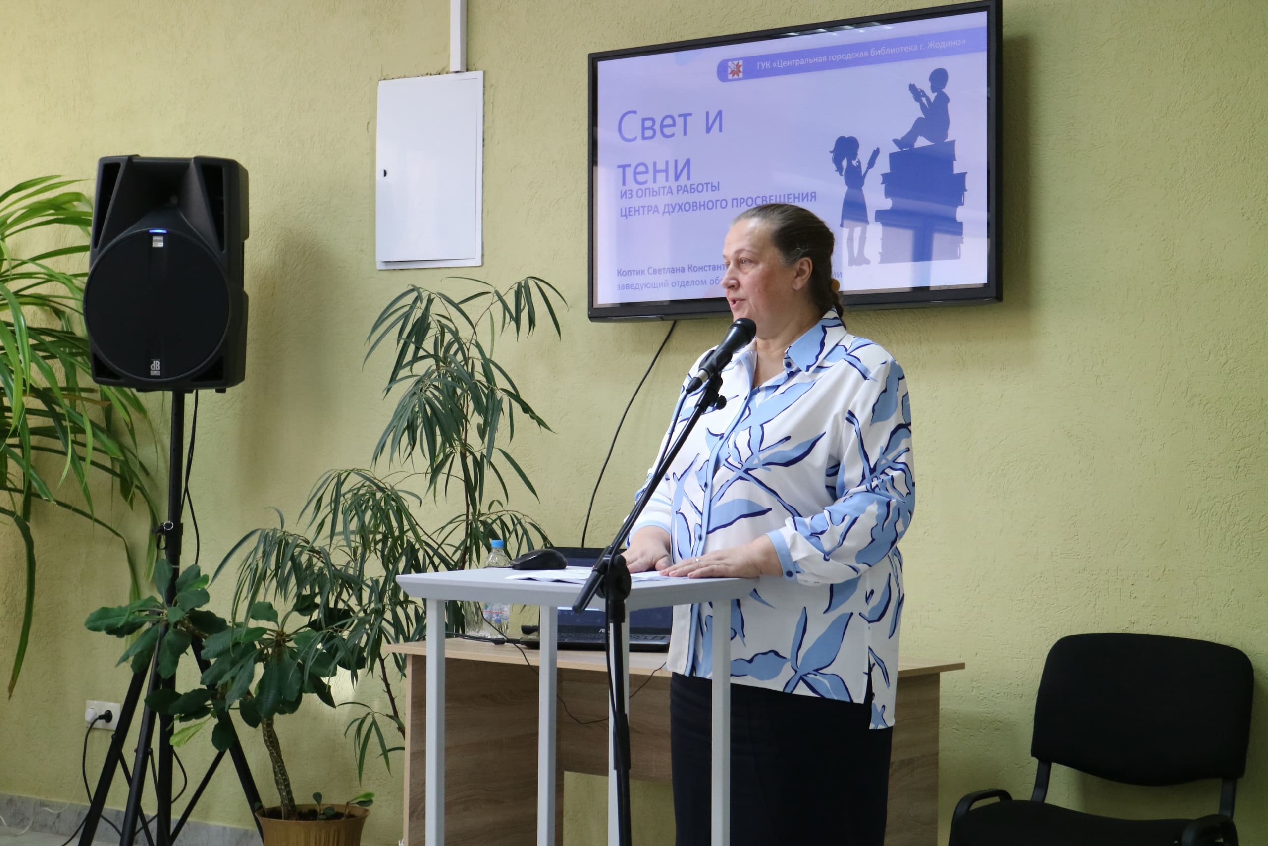 Светлана Константиновна Коптик, заведующий отделом обслуживания и информации Центральной городской библиотеки г. Жодино, представила на конференции доклад «Свет и тени: из опыта работы центра духовного просвещения». Светлана Константиновна поделилась уникальным опытом и практическими аспектами работы жодинской библиотеки в области духовно-нравственной деятельности. Особое внимание было уделено работе театра теней «Свет и тени», который стал эффективным инструментом для передачи глубоких духовных смыслов через искусство.
