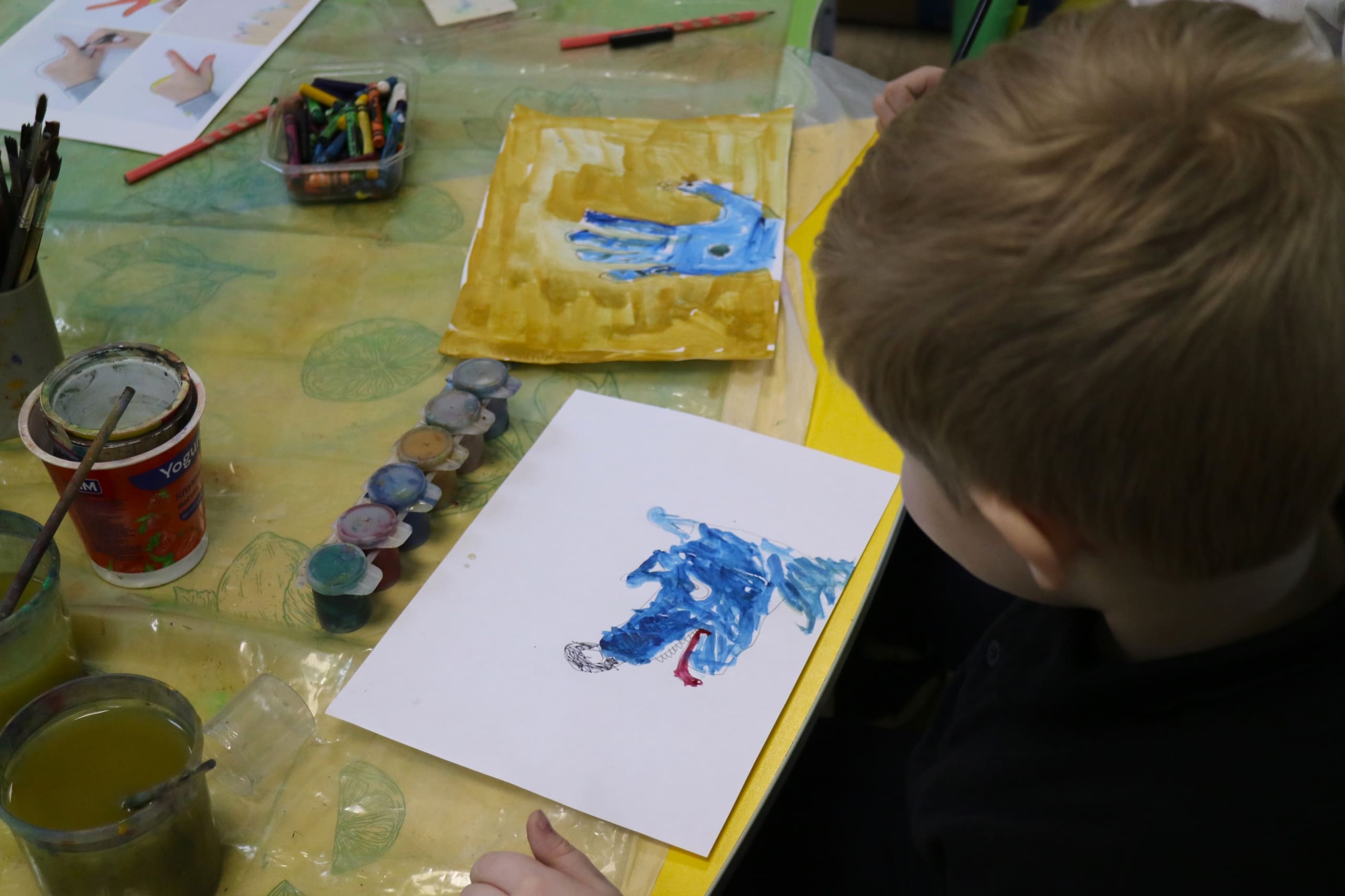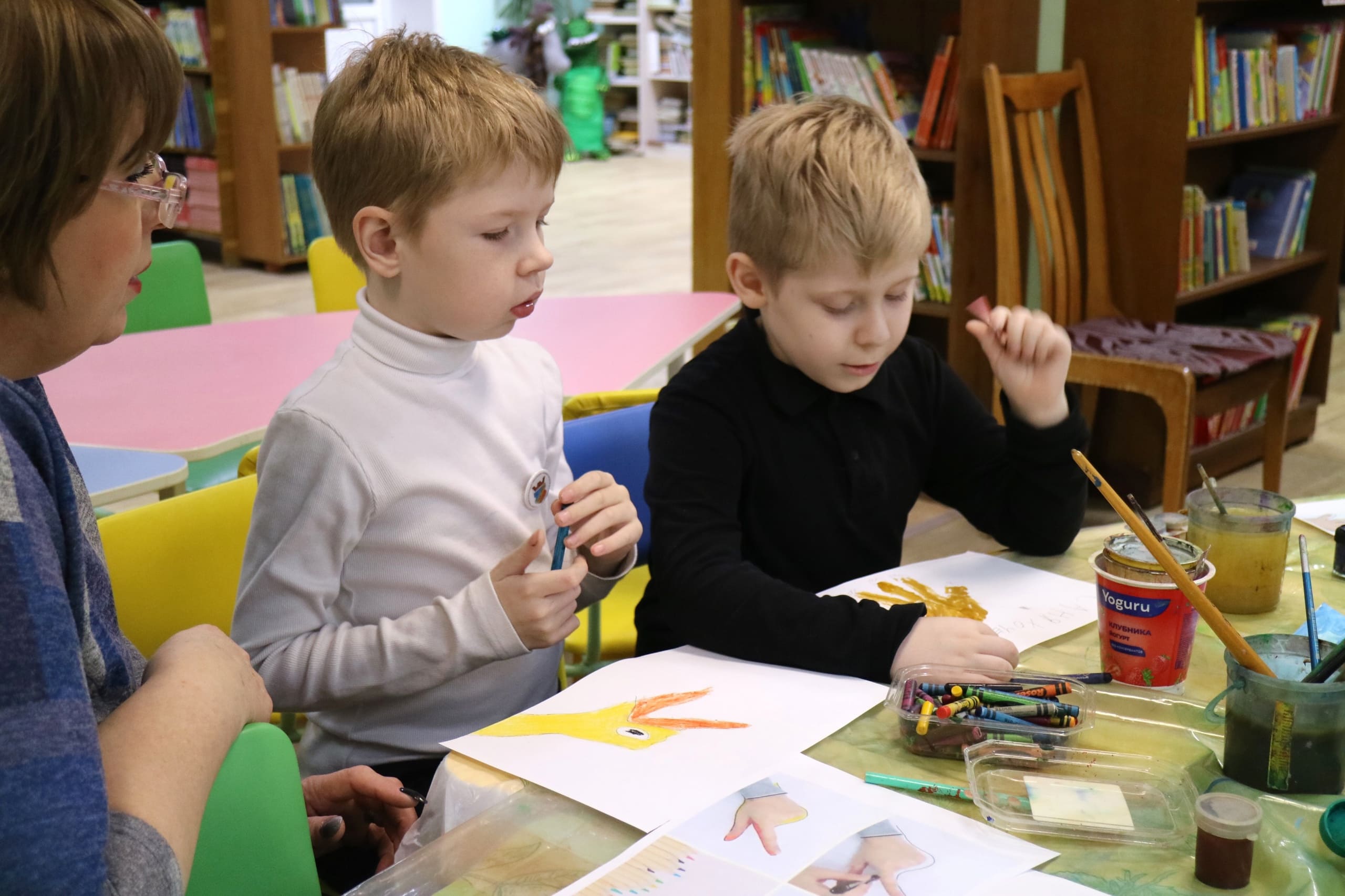 В технике рисования по контуру ладони участники библиоАРТа «Букварельки» изобразили сегодня волка, павлина, утку, слона и других животных.