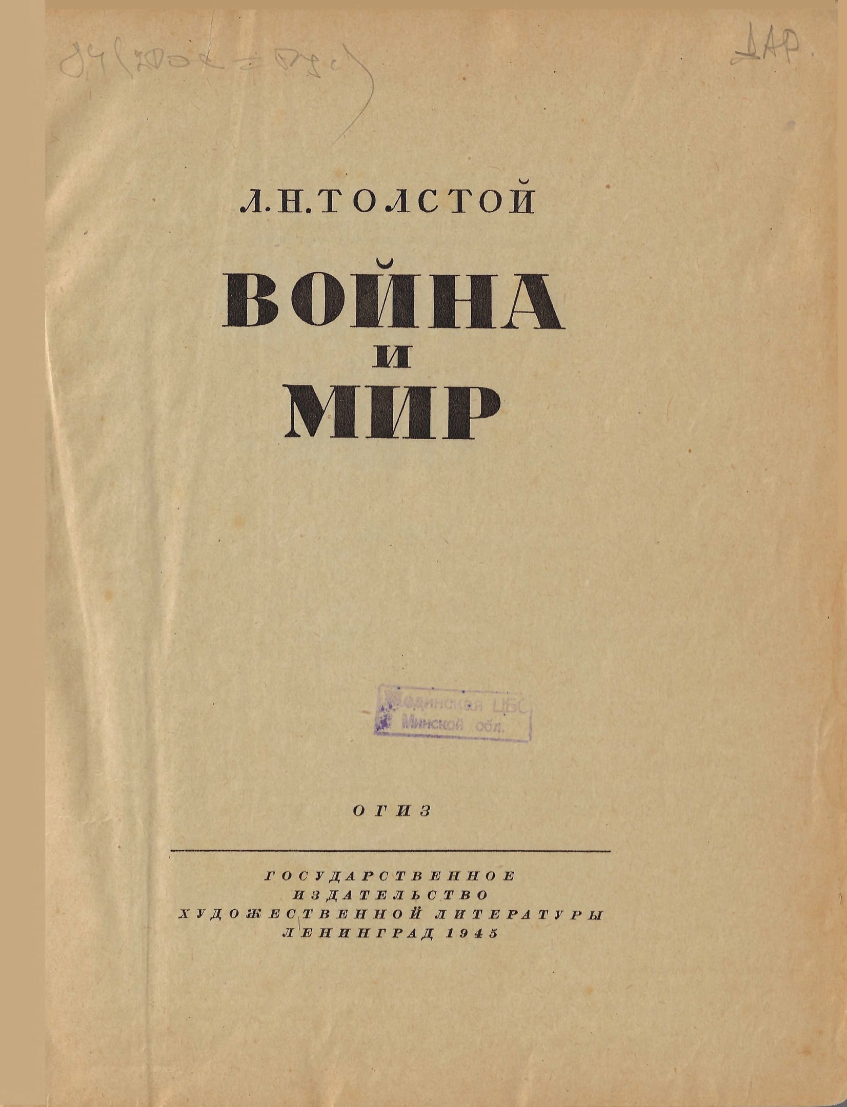 Толстой Л. Н. Война и мир / Л. Н. Толстой ; оформление Н. Ильина и Т. Цинберг. — Ленинград : Государственное издательство художественной литературы . — 1945. — 688 с.
