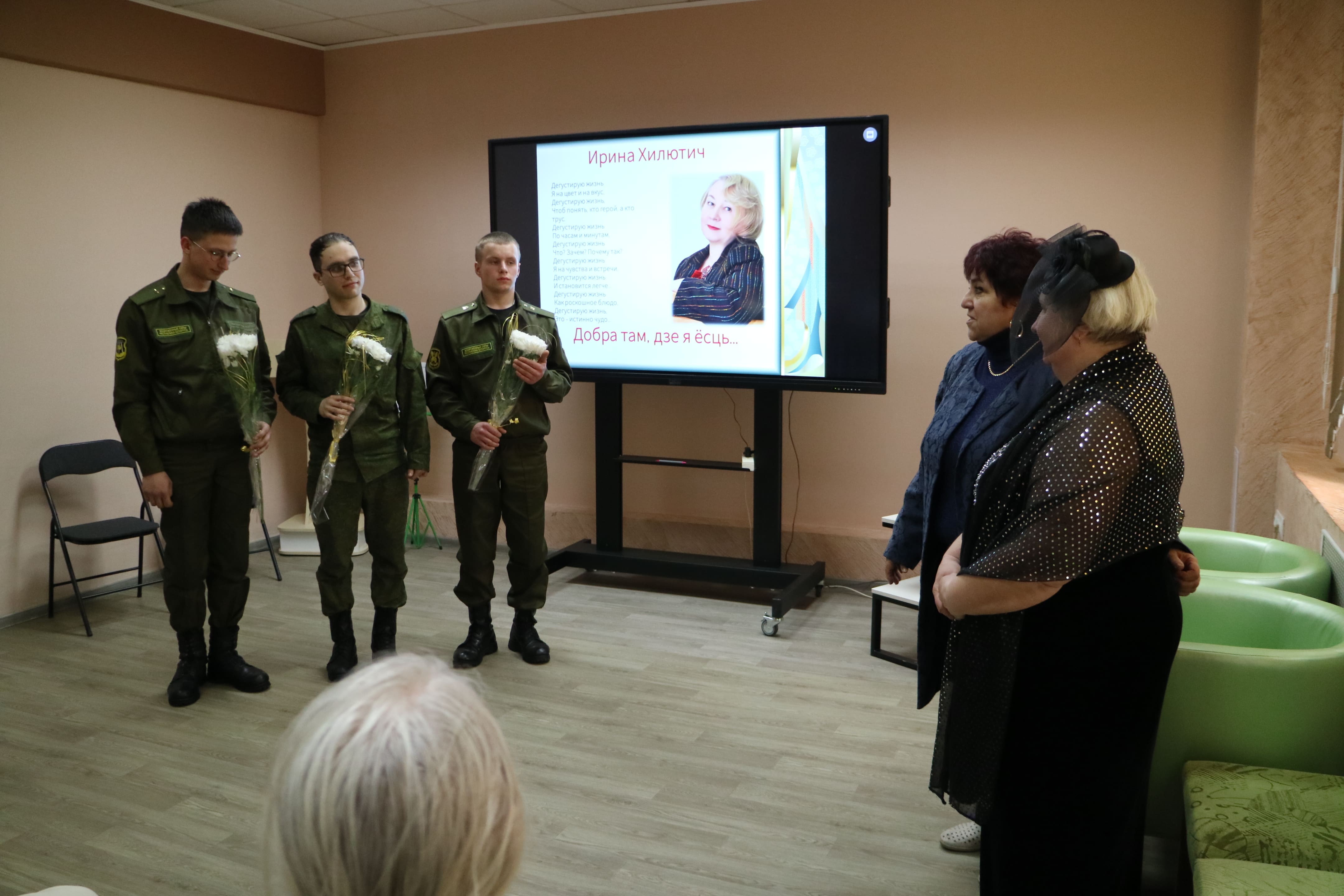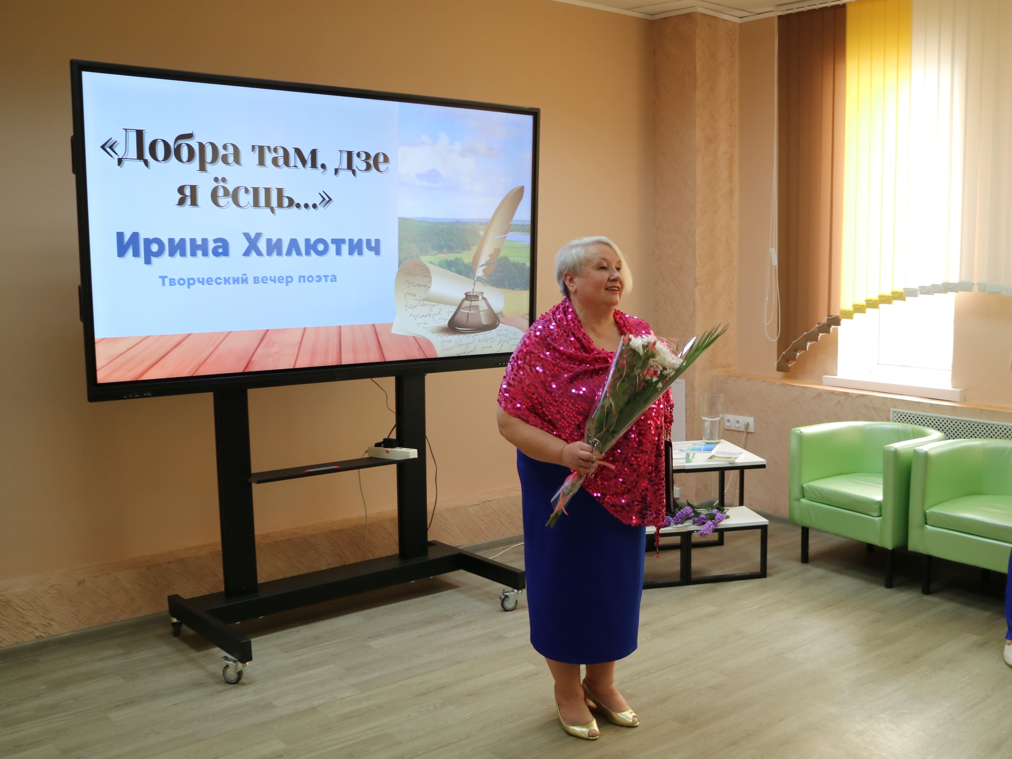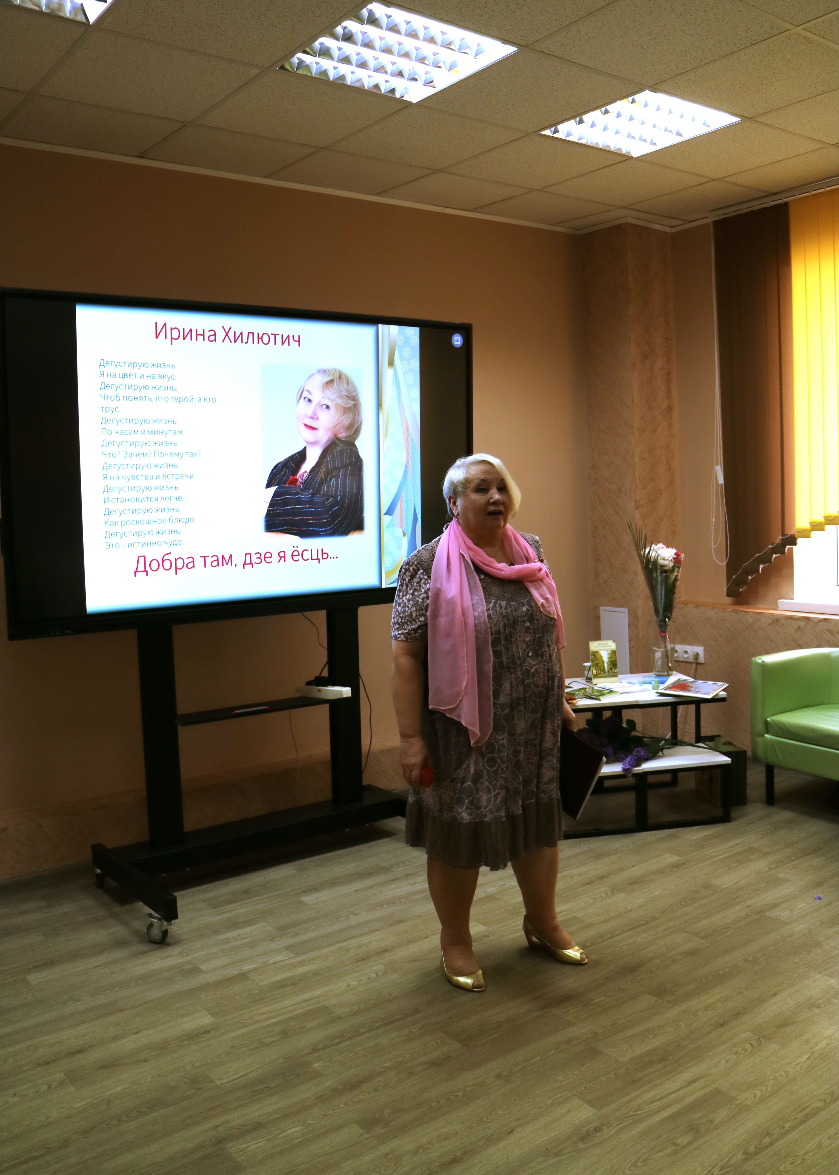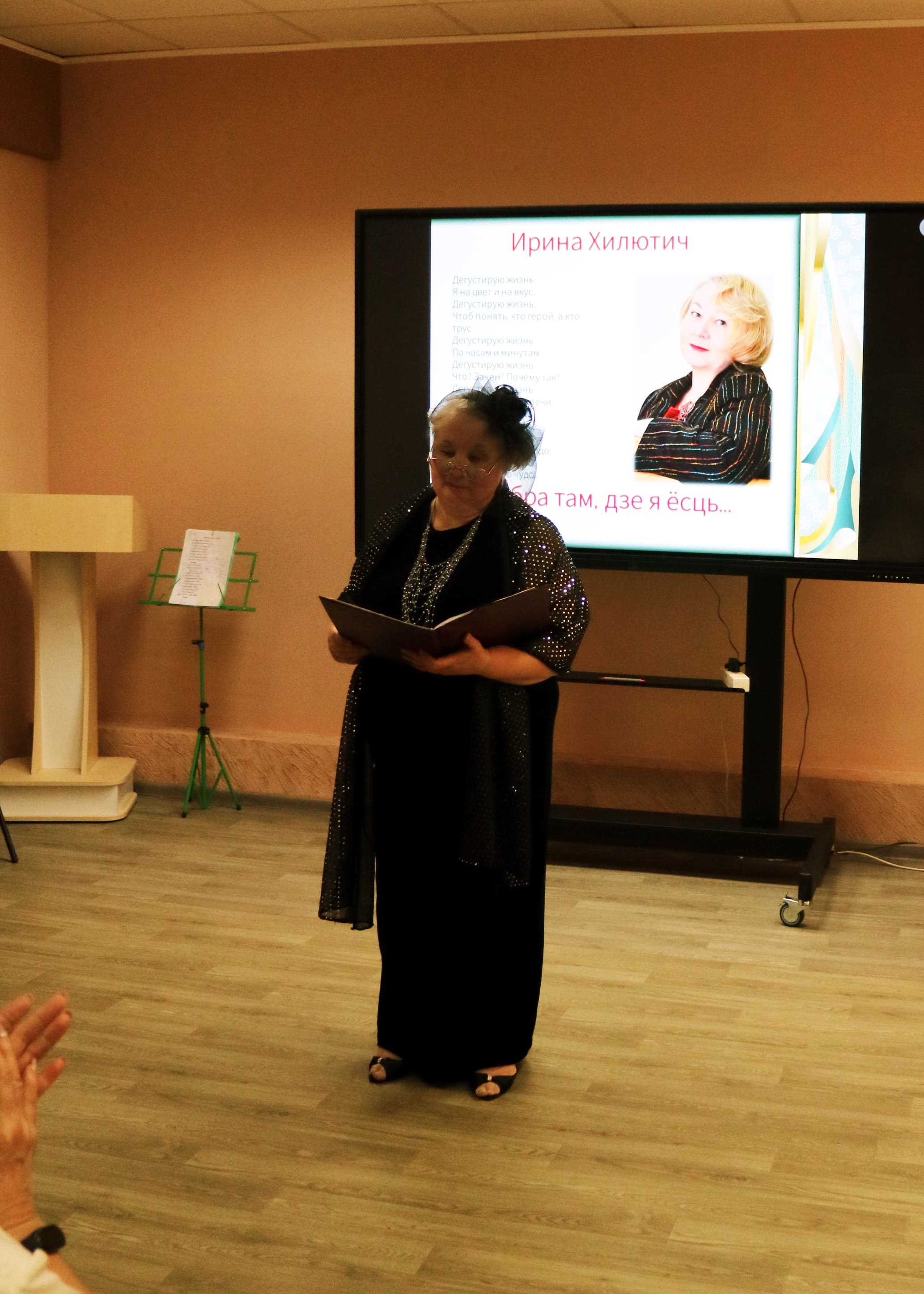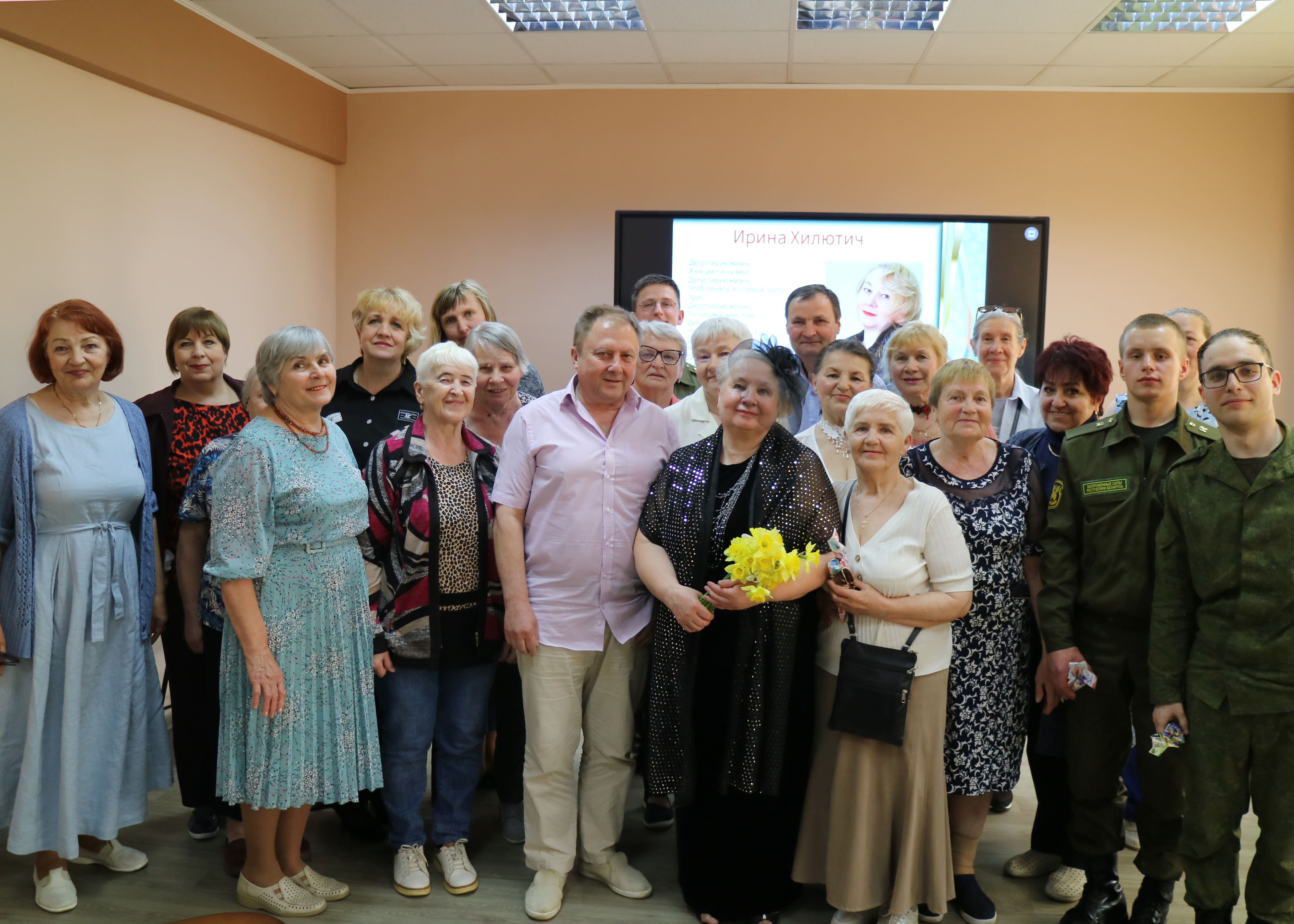 Героиня праздника – наша землячка, поэтесса, член народного любительского коллектива Республики Беларусь «Вдохновение» при Республиканском Дворце культуры ветеранов — Хилютич Ирина Анатольевна, удивительно талантливый человек, обладающий неиссякаемым оптимизмом и энергией, готовая к любым интересным творческим начинаниям.