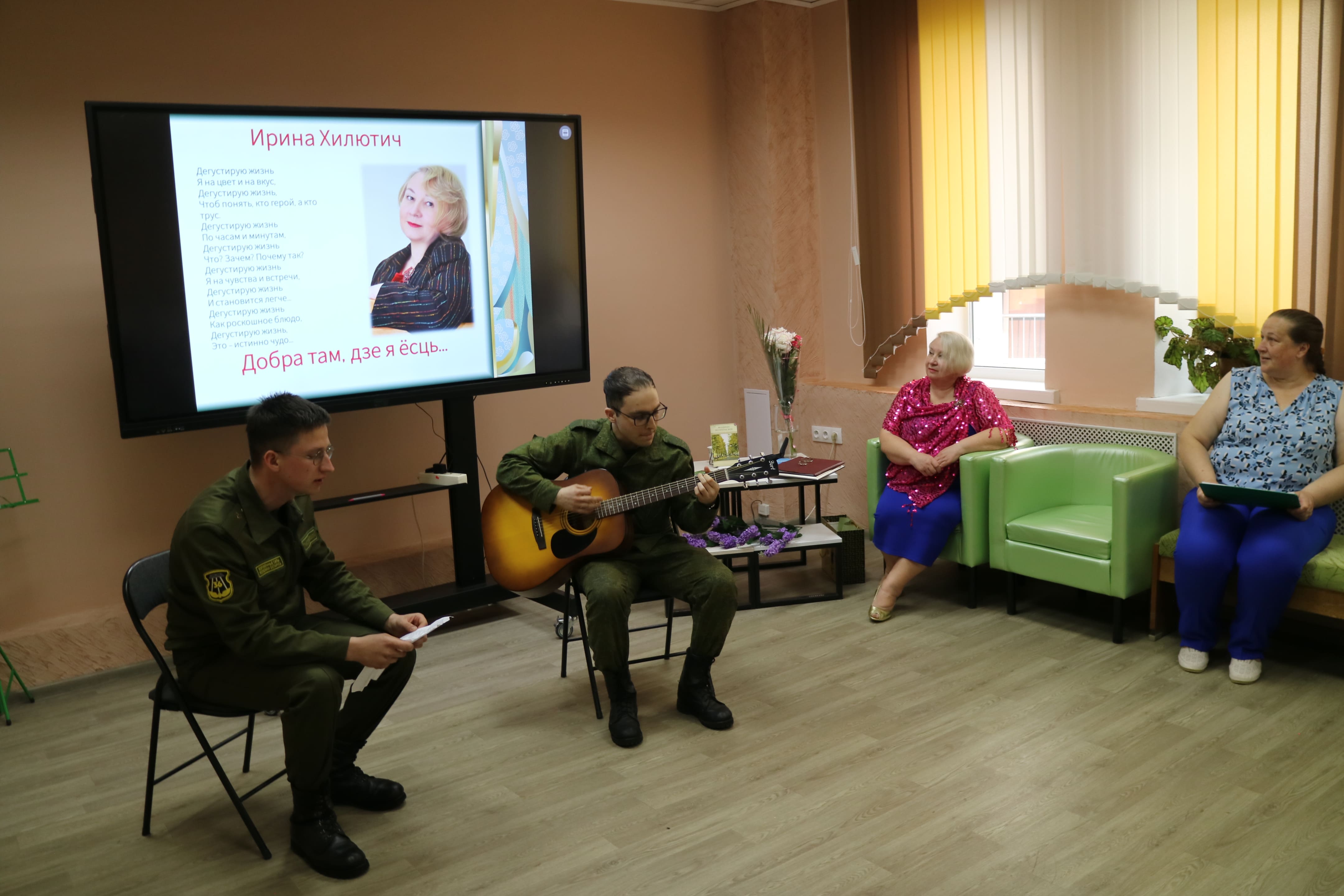 В творческом вечере приняли участие: Наталья Зайцева и Валентина Кузменкова, представлявшие народный вокальный ансамбль «У кругу сяброў», Ирина Феоктистова и Лидия Наумова — любительский вокальный коллектив «Калинушка» при Жодинской городской организации ветеранов.