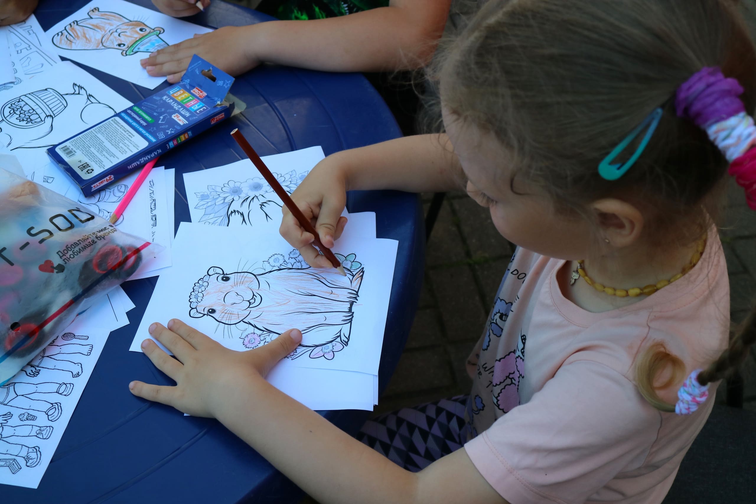Атмосфера творчества и игры царила сегодня на интерактивной площадке «Библиотека без стен». Девчонки занимались раскрашиванием бумажных кукол и их нарядов, проявляя фантазию и создавая уникальные образы. Не остались без внимания и милые капибары, которые вдохновили участников площадки на создание ярких рисунков. Ребята с удовольствием раскрашивали изображения этих животных, используя разнообразные цвета и техники, придумывали имена этим пушистым животным. Это занятие стало отличным способом выразить свои эмоции и познакомиться с миром природы.