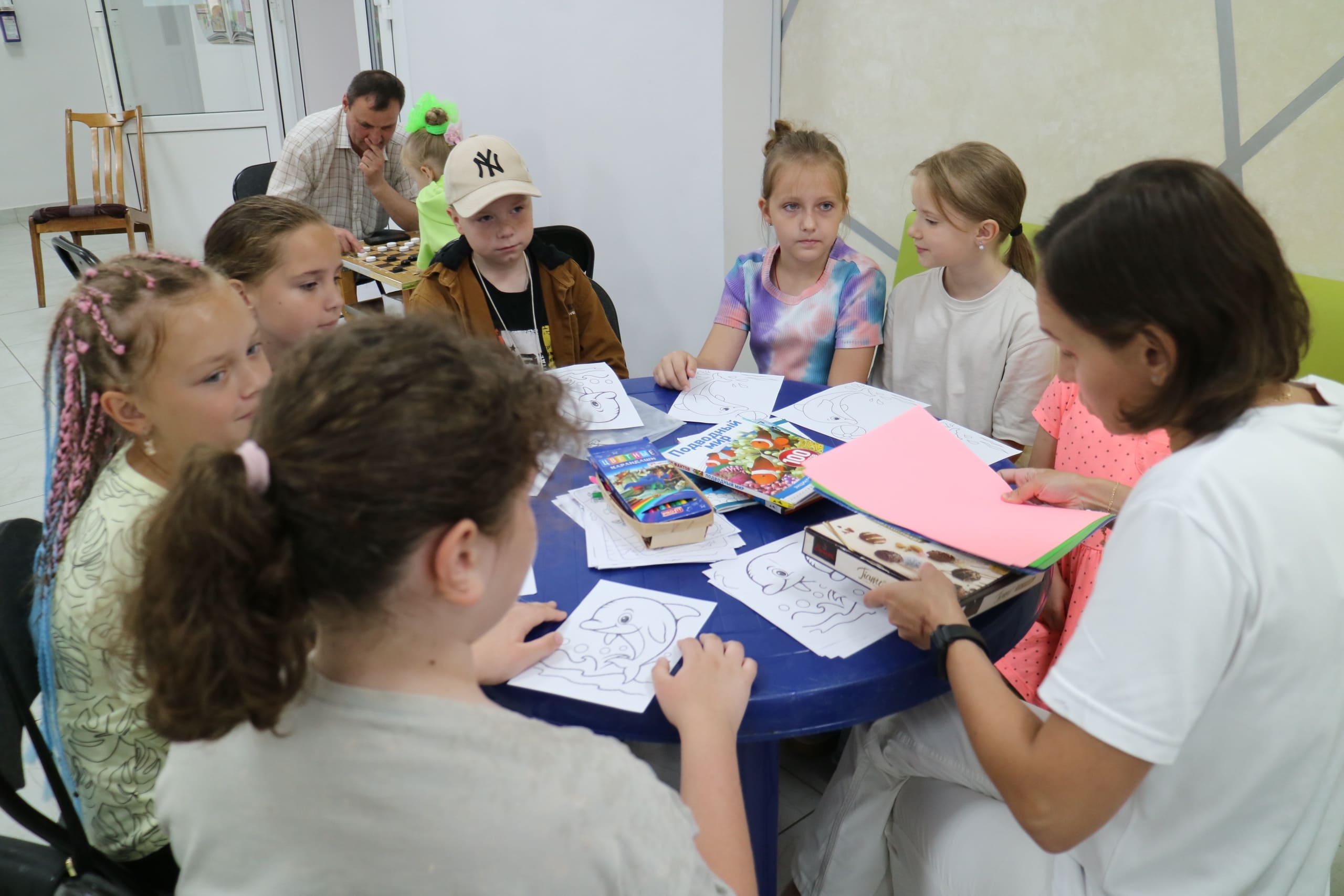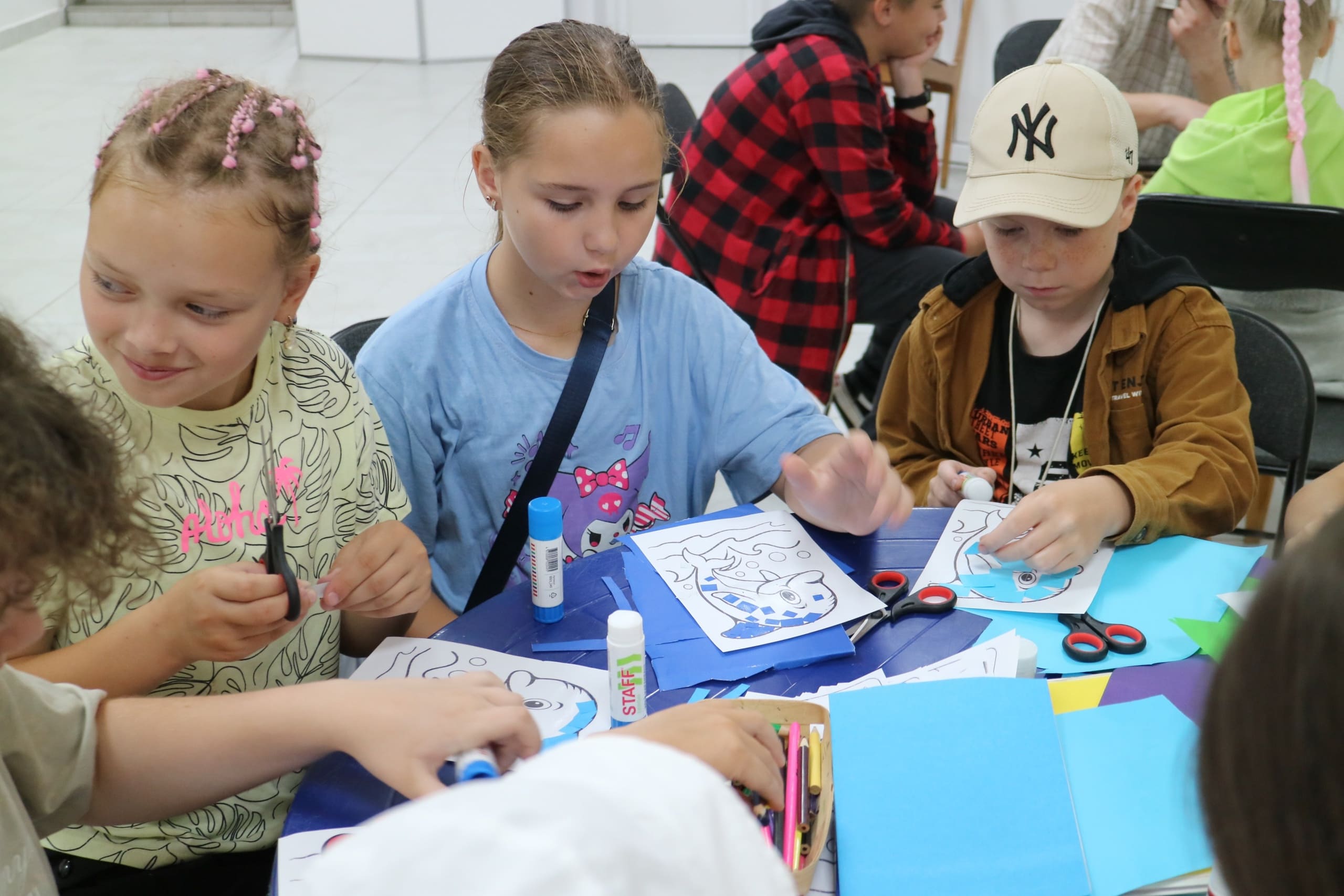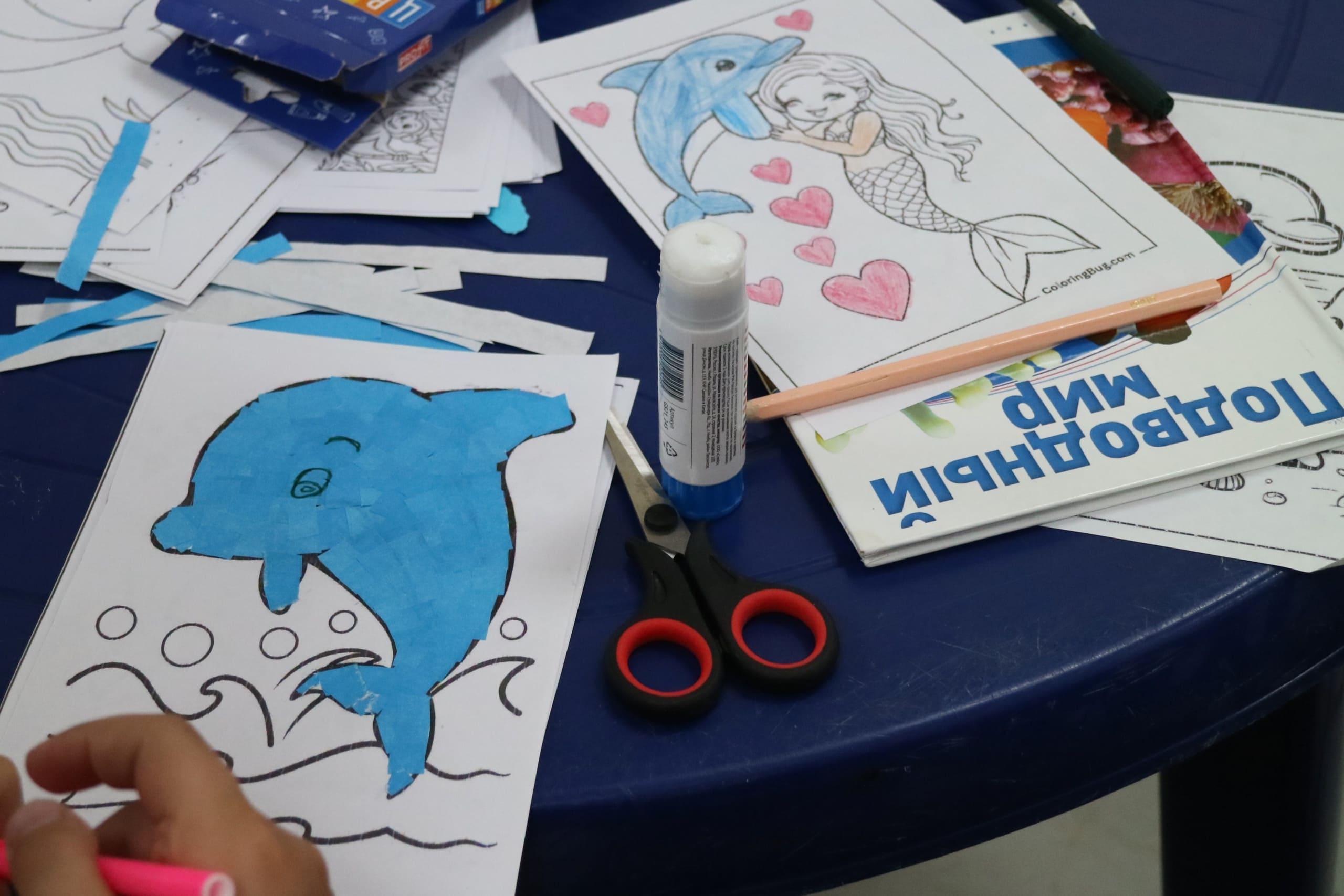 После познавательной части мероприятия ребята проявили свою творческую сторону, создавая дельфинов и китов из бумаги в виде аппликаций в мозаичной технике. Тематические раскраски также пользовались популярностью, позволяя детям выразить свою любовь к морским млекопитающим через творчество.