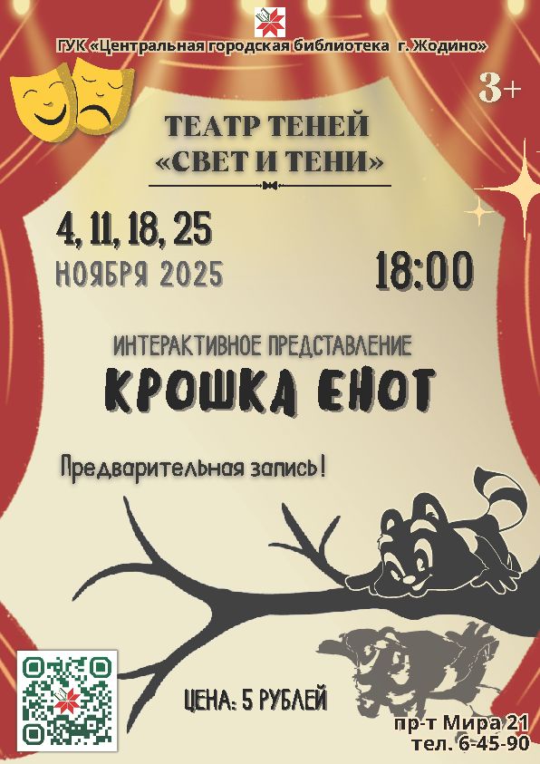 Дорогие друзья! Приглашаем вас на интерактивное представление «Крошка Енот», где вы сможете окунуться в таинственный мир волшебства света и теней.