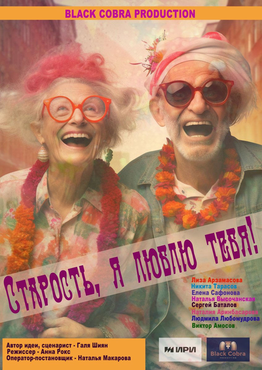 «Старость, я люблю тебя!» (Россия, 2023), сценарист: Галина Шиян, режиссер: Галина Шиян, Анна Рокс, композитор: Дмитрий Тархов, продюсер: Светлана Кобракова, студия-производитель: Black Cobra Production. Жанр: комедия абсурда. 12+