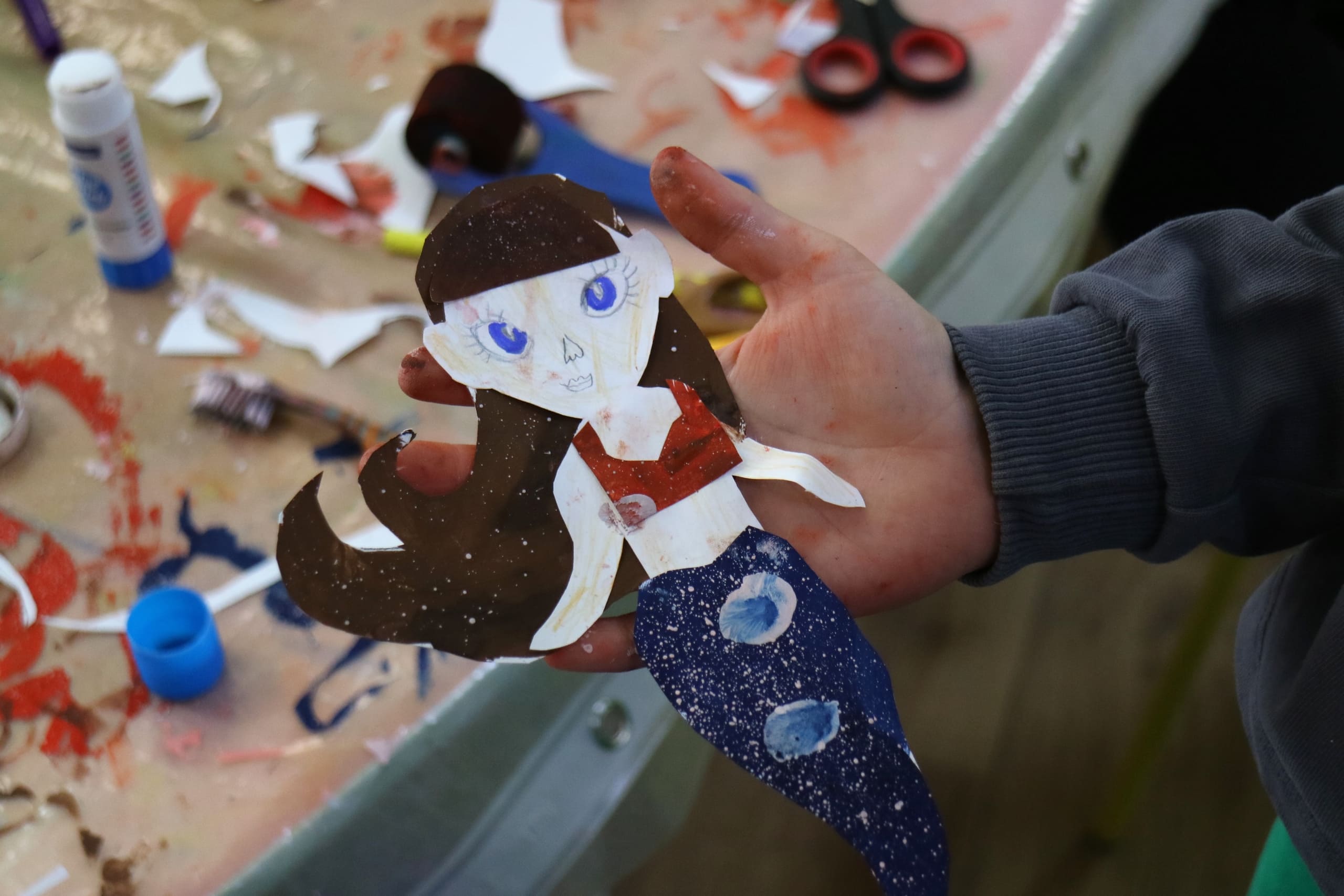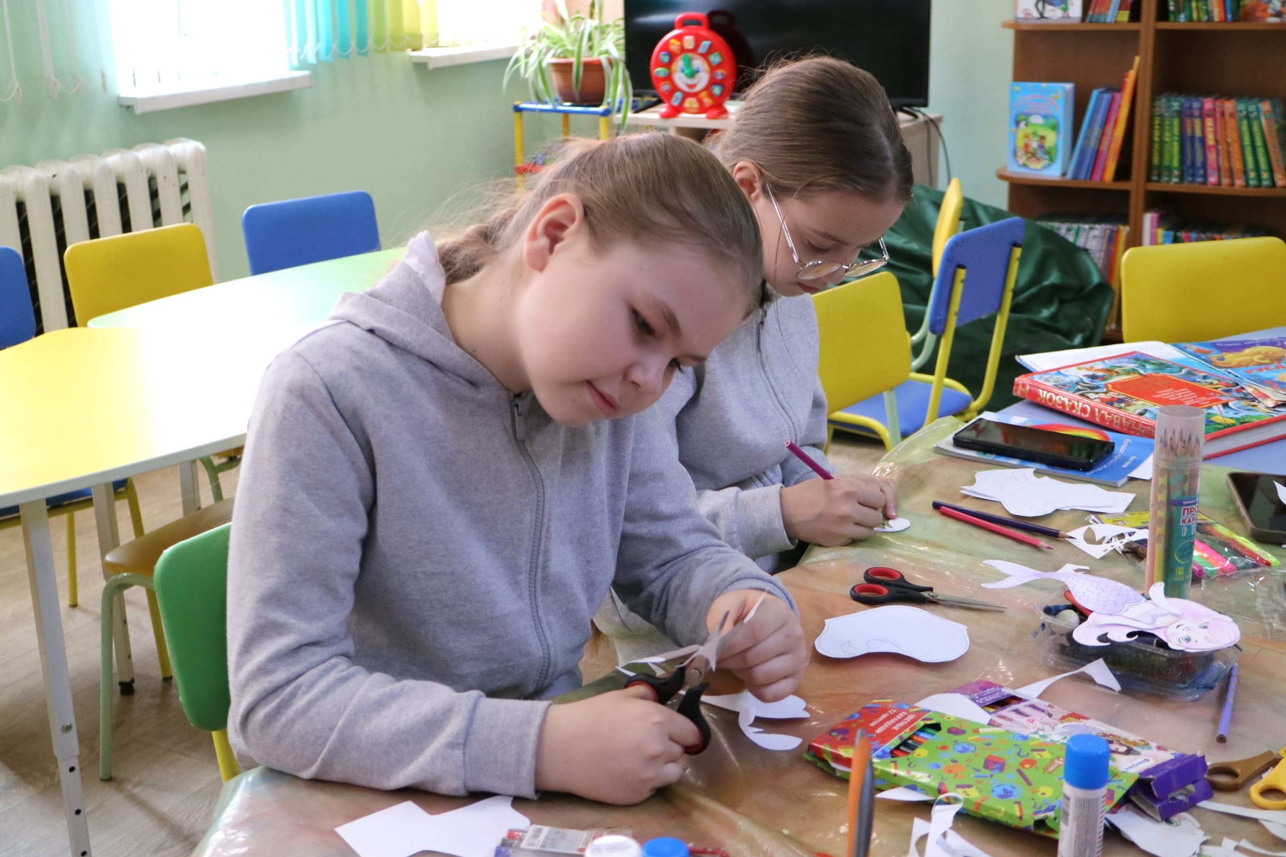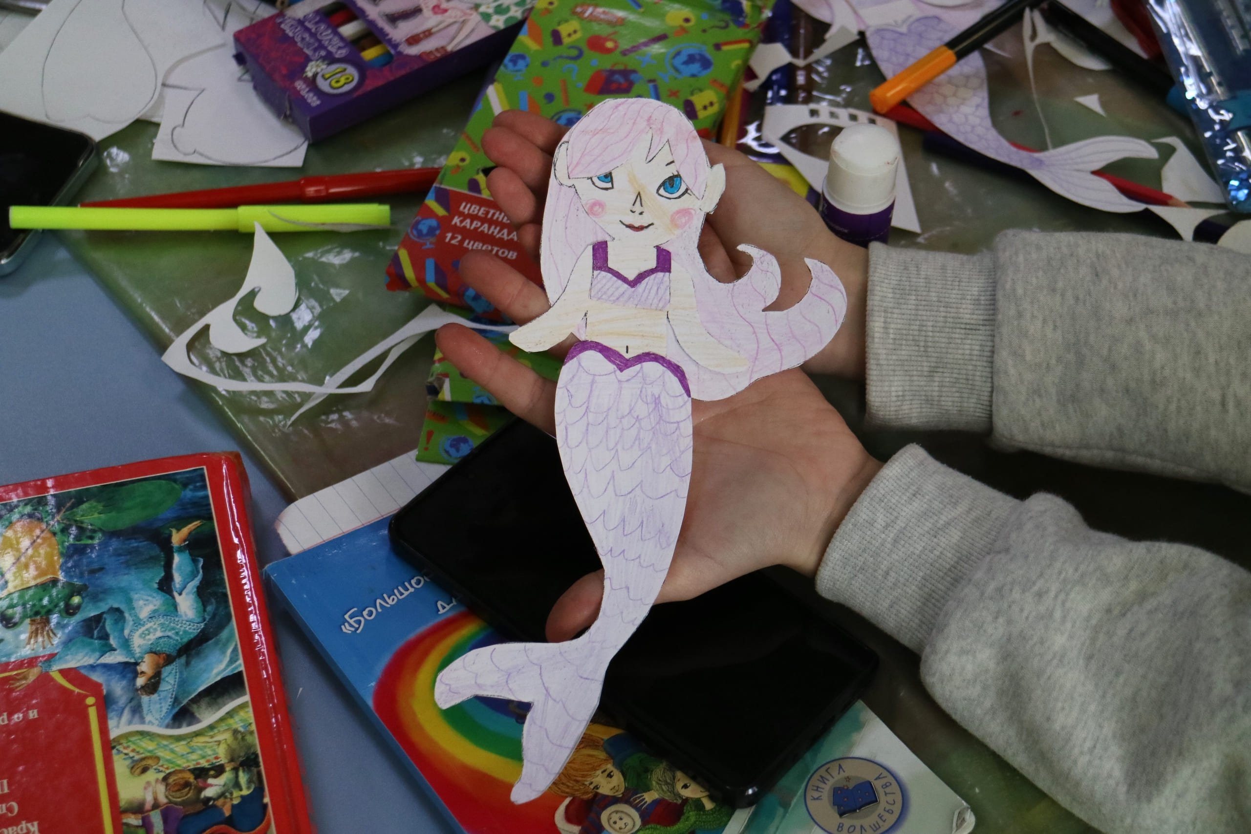 Сначала – вырезание из бумаги: плавные линии хвостов, завитки волос. Потом ребята склеивали части, соединяя их в одно целое. А затем началось самое интересное: раскрашивание. Кисточки и карандаши, как маленькие волшебные палочки, оживляли бумажных дев. Хвосты становились изумрудными, сиреневыми, в крапинку. Волосы – цвета морской пены или закатного солнца.